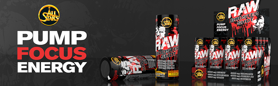All Stars Raw Intensity Booster Shot - Platinum Series.Everyone knows it: Early in the morning or after a stressful everyday life you need a kick to get the necessary motivation and concentration for the upcoming training session.The combination of the ingredients supports focus and concentration, provides some important ingredients for training and, as an addition to normal nutrition, can bring a real thrust for effective and intensive workout.A 60ml shot contains a total of 8.3g proteins that are available in different forms: the booster mainly consists of the branched chain amino acids (BCAAS) leucine, isolucin and valine, which are added in the proven ratio of 2: 1: 1.3000mg L-Leucin, 1500mg L-Isoleucin 1500mg L-Valin are included per 60ml shot.In addition, 3000mg of the amino acids L-Citrullin and L arginine are included.The caffeine (200 mg per shot) acts as a guard before training.There are less than 0.1g fat, only 1.2g of carbohydrates and only 0.1g sugar.The supplement can therefore be inserted into a wide variety of nutritional plans and diets - regardless of whether lowfat, ketogenic or metabolic diet.The RAW Intensity Shot is a real refreshment not only because of its ingredients, but also due to the summer-fruity taste!The booster shot can be taken at any time of the day - preferably 30 minutes before the start of the training.Do not combine the shot with other caffeinated drinks. Ingredients ingredients Water, Leucin 4.8 , Citrullin 4.8 , arginine alpha-ketoglutarate 4.8 , isolucin 2.4 , valin 2.4 , aroma, glycin 0.8 , coloring food (concentrate from lemon,Saflor, apple, carrot), thickener Xanthan, emulsifier (lecithine (from soy), mono- and diglycerides of food fatty acids), preservatives potassium sorbat, sweetener (acesulfam k, sucralose), caffeine. Instructions 1 shot (60ml) 30 minutes before training.The recommended daily consumption of 1 Shot must not be exceeded.Do not combine with other sources of caffeine (energy drinks, coffee).Keep out of reach of small children.Dietary supplements are not a substitute for a balanced, varied diet and a healthy lifestyle. Warnings A varied, balanced diet and a healthy lifestyle are important for health.Not suitable for pregnant women, nursing and children.Do not use as a replacement for a balanced and varied diet.Keep out of reach of small children. Address manufacturer importer All Stars Fitness Products GmbH, Postfach 70, 82378 Peißenberg FRG MoreTropical - The delicious power shot is a real refreshment not only because of its ingredients, but also due to the summer -fruity taste!.Take - whether early in the morning or after a stressful day - the Pre Workout Booster can be taken at any time of the day - preferably 30 minutes before the start of the training.Fitness booster - 200mg caffeine per portion give you an energy kick before training - get everything out of you in the gym get you to a new level!.For every diet - the supplement contains less than 0.1g fat, only 1.2g of carbohydrates only 0.1G sugar.So it is compatible with a wide variety of diets, whether lowfat, ketogenic or metabolic diet.The highest quality-the ingredients in the liquid are scientifically tested: With the BCAAS L-Leucin, L-Isoleucin L-Valin and L-Citrullin L arginine, high-quality amino acids are included.ALL STARS Raw Intensity Booster Shot - Platinum Series. Jeder kennt es: Früh am Morgen oder nach einem stressigen Alltag braucht man einen Kick, um sich die nötige Motivation und Konzentration für die anstehende Trainingseinheit zu holen. Die Kombination der Inhaltsstoffe unterstützt Fokus und Konzentration, liefert einige wichtige Inhaltsstoffe fürs Training und kann als Zusatz zur normalen Ernährung einen echten Schub für ein effektives und intensives Workout bringen. Ein 60ml Shot enthält insgesamt 8,3g Proteine, die in verschiedener Form vorliegen: Der Booster besteht vorwiegend aus den verzweigtkettigen Aminosäuren (BCAAs) Leucin, Isoleucin und Valin, die im bewährten Verhältnis von 2:1:1 zugefügt sind. Pro 60ml Shot sind also 3000mg L-Leucin, 1500mg L-Isoleucin 1500mg L-Valin enthalten. Zudem sind jeweils 3000mg der Aminosäuren L-Citrullin sowie L- Arginin enthalten. Als Wachmacher vor dem Training fungiert das Koffein (200 mg pro Shot). Pro Portion sind weniger als 0,1g Fett, nur 1,2g Kohlenhydrate und nur 0,1g Zucker enthalten. Das Supplement kann also in die verschiedensten Ernährungspläne und Diäten eingefügt werden - egal ob LowFat-, ketogene oder metabole Diät. Der Raw Intensity Shot ist nicht nur aufgrund seiner Zutaten, sondern auch durch den sommerlich-fruchtigen Geschmack eine echte Erfrischung! Der Booster Shot kann zu jeder Tageszeit eingenommen werden - am besten 30 Minuten vor dem Trainingsbeginn. Den Shot nicht mit anderen koffeinhaltigen Getränken kombinieren. INHALTSSTOFFE ZUTATEN Wasser, Leucin 4,8 , Citrullin 4,8 , Arginin Alpha-Ketoglutarat 4,8 , Isoleucin 2,4 , Valin 2,4 , Aroma, Glycin 0,8 , färbendes Lebensmittel (Konzentrat aus Zitrone, Saflor, Apfel, Karotte), Verdickungsmittel Xanthan, Emulgatoren (Lecithine (AUS SOJA), Mono- und Diglyceride von Speisefettsäuren), Konservierungsmittel Kaliumsorbat, Süßstoff (Acesulfam K, Sucralose), Koffein. GEBRAUCHSANWEISUNG 1 Shot (60ml) 30 Min. vor dem Training trinken. Die empfohlene tägliche Verzehrmenge von 1 Shot darf nicht überschritten werden. Nicht mit anderen Koffeinquellen (Energy Drinks, Kaffee) kombinieren. Außerhalb der Reichweite von kleinen Kindern aufbewahren. Nahrungsergänzungsmittel sind kein Ersatz für eine ausgewogene, abwechslungsreiche Ernährung sowie gesunde Lebensweise. WARNHINWEISE Eine abwechslungsreiche, ausgewogene Ernährung und eine gesunde Lebensweise sind wichtig für die Gesundheit.Die angegebene empfohlene tägliche Verzehrsmenge darf nicht überschritten werden! Für Schwangere, Stillende und Kinder nicht geeignet. Nicht als Ersatz für eine ausgewogene und abwechslungsreiche Ernährung verwenden. Außerhalb der Reichwei