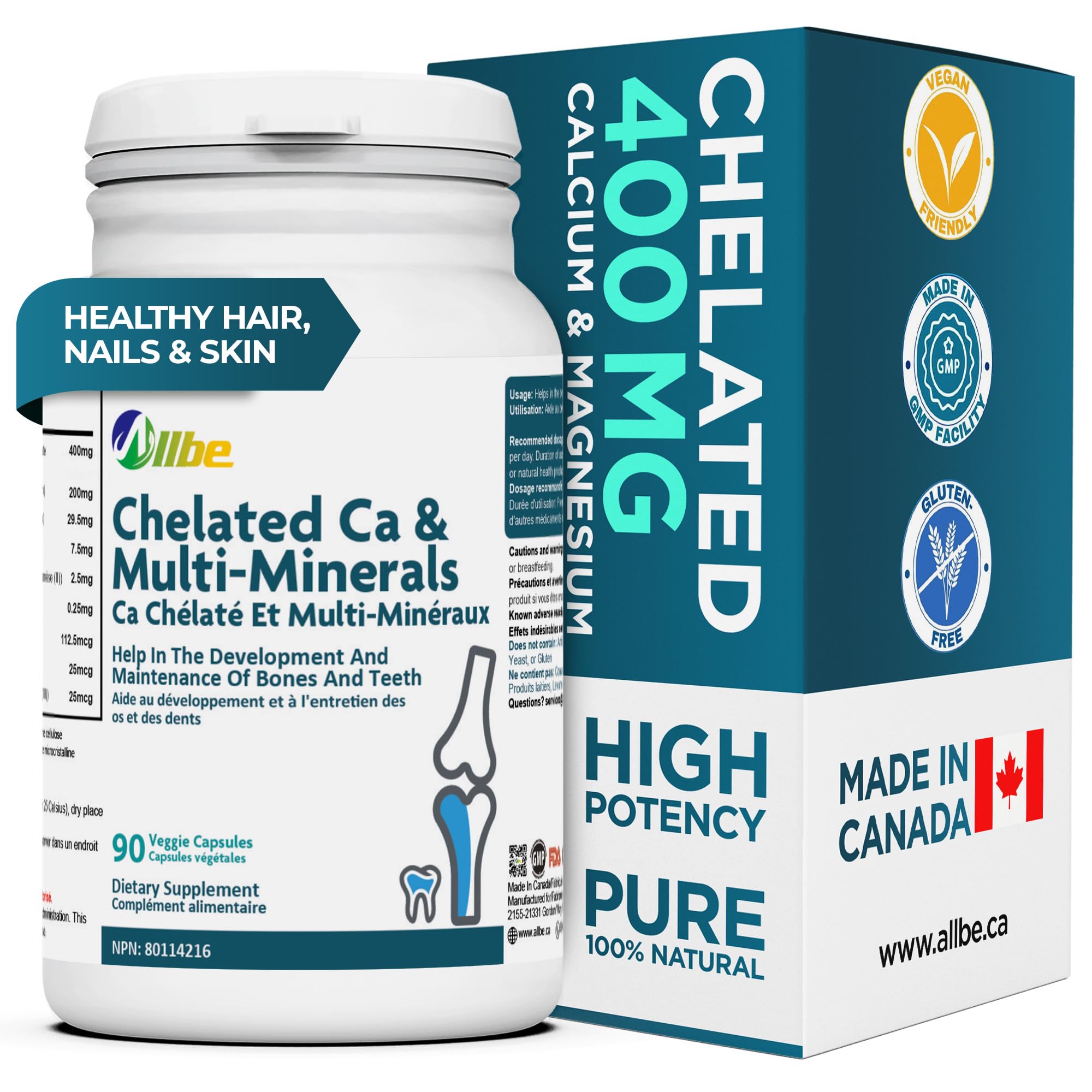 PROUDLY CANADIAN MADE: Every bottle contains 120 capsules of calcium and multi minerals, made in Canada in a FDA registered facility that adheres to GMP guideline stored in airtight container protected from light. OPTIMUM METABOLISM: This Calcium Magnesium Zinc supplement is full of essential trace minerals including Manganese, Copper, Potassium, Iodine, Selenium and Chromium promoting healthy bones and tissues. ELEVATED MINERAL SUPPORT: This Zinc Magnesium supplement may help to form red blood cells and maintain electrolyte balance and formation of connective tissue. THYROID SUPPORT: Our Calcium Magnesium supplements contain highly absorbable multi-minerals that may help in the function of thyroid gland maintain the body's ability to metabolize nutrients. CALCIUM PACKED: Allbe Chelated Calcium supplements may support healthy hair, nail and skin in addition to promoting the development of healthy bones teeth.
