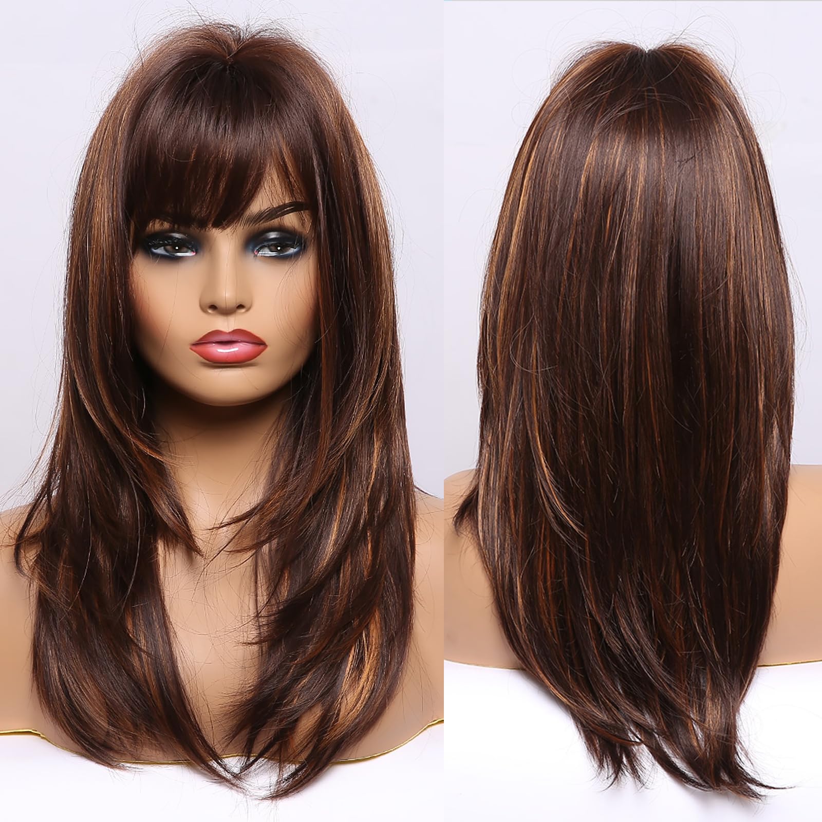 Esmee 24 inch Long Curly Hair Wigs for Women Brown Natural Synthetic Heat Resistant Wigs with Bangs