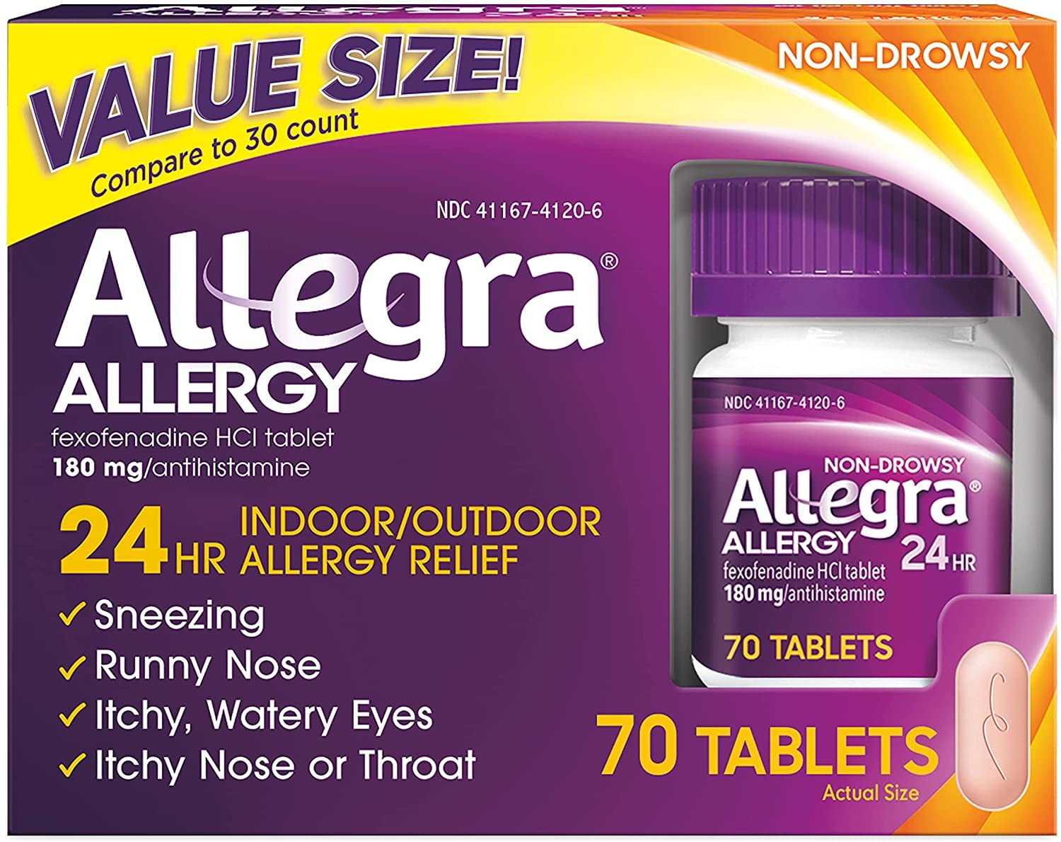 For your allergy symptoms, nothing works faster than Allegra Adult 24-Hour Allergy Relief Tablets. Allegra allergy relief medicine starts working in one hour for relief from sneezing, runny nose, itchy and watery eyes, and itchy nose or throat. One pill provides 24-hour allergy relief that doesn't make you drowsy and affect your normal brain function. Each tablet is formulated with active ingredient fexofenadine HCI for powerful relief from indoor and outdoor allergens like pollen, ragweed, grass, trees, dust, mold, and pet dander. Stock up on Allegra 24-Hour Tablets for fast , effective allergy relief. That's a no-brainer. Starts working in one hour applies to first dose only. Among single-ingredient non-drowsy OTC branded oral antihistamines.