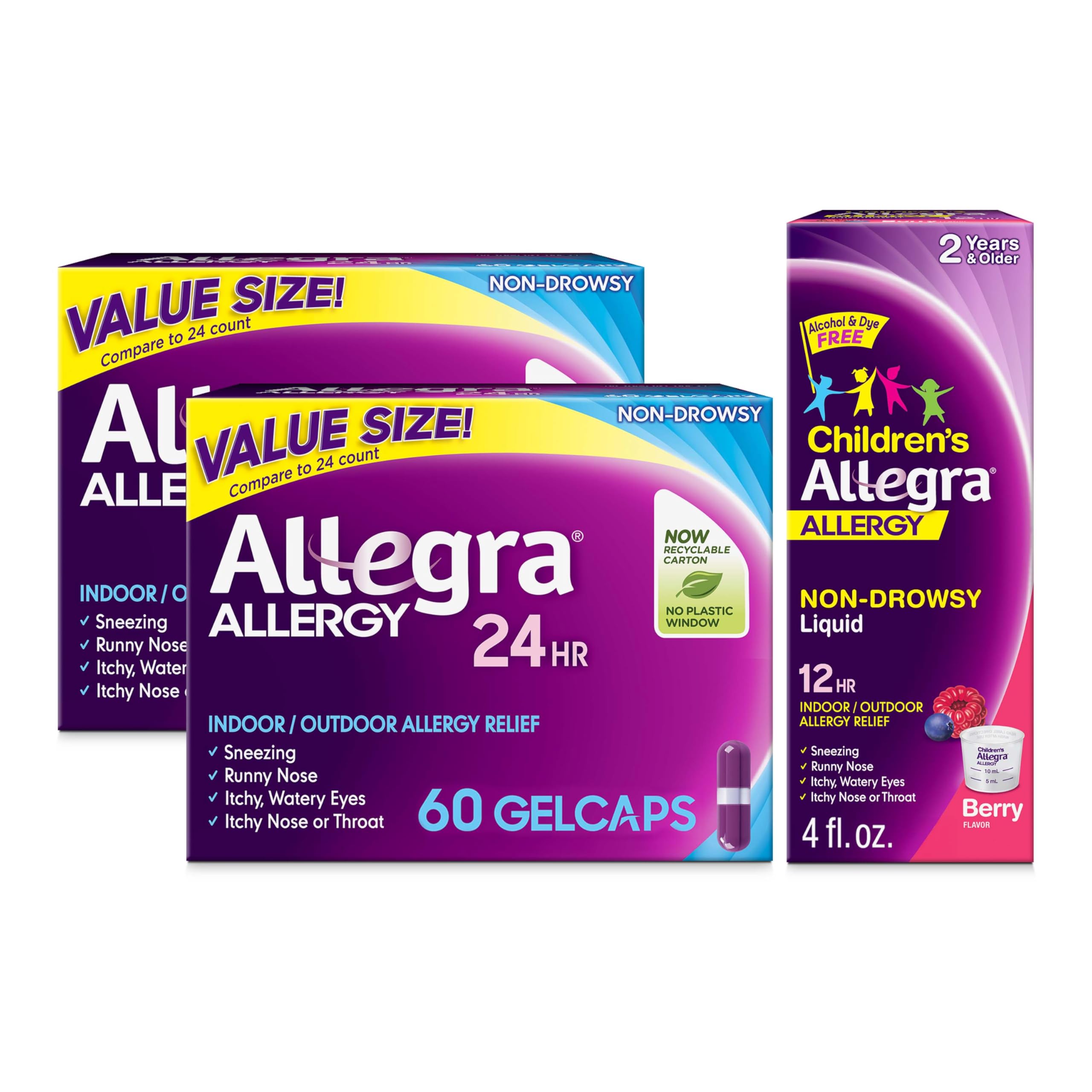 ALLERGIST RECOMMENDED: Allegra is the No. 1 allergist-recommended non-drowsy brand among OTC oral antihistamines. INDOOR OUTDOOR ALLERGIES: Use Allegra gelcaps and children's liquid for seasonal outdoor and indoor allergens like pollen, ragweed, grass, trees, dust, mold, and pet dander. FAST-ACTING: Allegra allergy medicine starts working in one hour for fast relief from sneezing, runny nose, itchy and watery eyes, and itchy nose or throat. NON-DROWSY: Formulated with active ingredient fexofenadine, a non-drowsy OTC medication with 0 brain interference. LASTING RELIEF: Take Allegra antihistamine pill day or night for 24-hour allergy relief. Give kids one dose of Allegra liquid antihistamine day or night for 12-hour allergy relief. INCLUDES: Two (2) 60-count packs of Allegra Adult 24HR Allergy Relief Gelcaps, Non-Drowsy Allergy Medicine and One (1) 4 oz. Allegra Children's 12HR Allergy Relief Liquid, Berry Flavor.