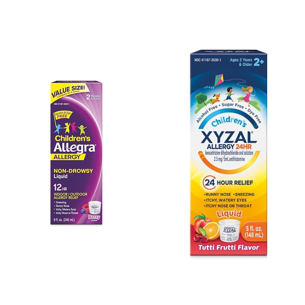 RELIEF FOR INDOOR OUTDOOR ALLERGIES: Use this bundle for relief from indoor and outdoor allergies, including seasonal, pet, sneezing, runny nose, itchy eyes, and more. NON-DROWSY STARTS WORKING IN 1 HOUR: Allegra is formulated with fexofenadine, a non-drowsy antihistamine, while Xyzal starts working in just 1 hour. BERRY FLAVOR LIQUID TUTTI FRUTTI FLAVOR: Allegra comes in a berry flavor liquid while Xyzal comes in a tutti frutti flavor that kids love. 12-HOUR 24-HOUR RELIEF: Allegra provides 12 hours of relief from allergy symptoms while Xyzal provides 24-hour relief that is as effective at hour 24 as it is at hour 1. INCLUDES: One (1) 8-ounce bottle of Allegra Children's Non-Drowsy Antihistamine Liquid for 12-Hour Allergy Relief and one 5-fluid ounce bottle of Xyzal Children's Oral Solution for 24-Hour Allergy Relief for Kids.