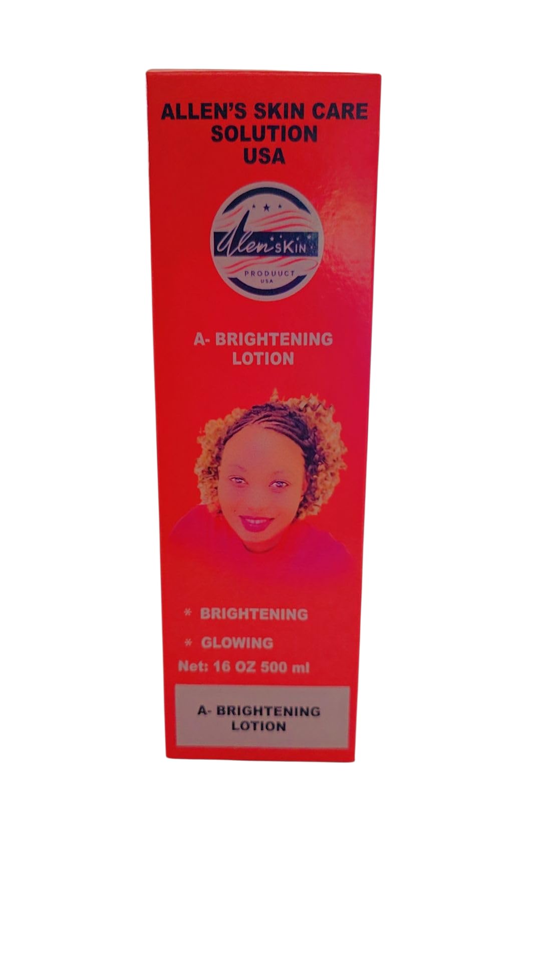 Discover radiant, youthful-looking skin with Allen's Skin Care Solution USA A-Brightening Lotion. This premium 16 fl oz (500ml) formula is specially designed to enhance your natural glow while providing deep nourishment to your skin. The brightening lotion works to promote a clearer, more luminous complexion while maintaining skin's natural moisture balance. Perfect for daily use, this lotion helps achieve that sought-after glowing appearance while keeping your skin well-hydrated and nourished. The generous bottle size ensures long-lasting use, making it an excellent value for your skincare routine. For best results, apply the lotion evenly to clean skin, focusing on areas that need extra brightening attention. Regular use helps maintain skin's natural radiance and supports a more youthful-looking appearance.
