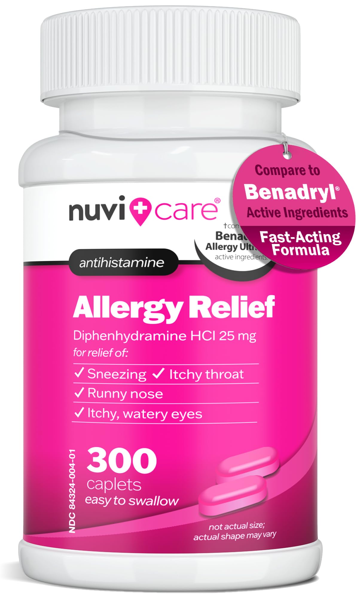QUALITY YOU CAN TRUST - Nuvicare Allergy Relief Diphenhydramine HCl tablets are produced in a facility that meets stringent quality and safety standards. Trust Nuvicare for reliable and effective OTC solutions at generic value, and receive only the highest quality products for your health needs. FAST-ACTING FORMULA - With our fast-acting formula, you won't have to wait around to start feeling better. This anti allergy medicine is for adults and works by quickly alleviating symptoms, so you can get back to work and your other activities without missing a beat. RELIEVES MULTIPLE SYMPTOMS - These antihistamines for adults are designed to address a variety of symptoms including itchy eyes throat, runny nose, sneezing, and more. Get all the relief you need from one single, effective dose taken beforehand or when symptoms present. DIPHENHYDRAMINE HCL 25 MG - Each pink tablet contains 25 mg of diphenhydramine HCl, a proven effective antihistamine. Diphenhydramine is widely used in OTC medications treatments to relieve common allergy symptoms by blocking the body's histamine response. ALLERGY RELIEF: COMPARE TO BENADRYL - Give yourself rapid relief from allergy symptoms with Nuvicare generic allergy pills in pink tablet form. Effective against multiple symptoms. Compare to the active ingredient in name-brand over-the-counter allergy medication.