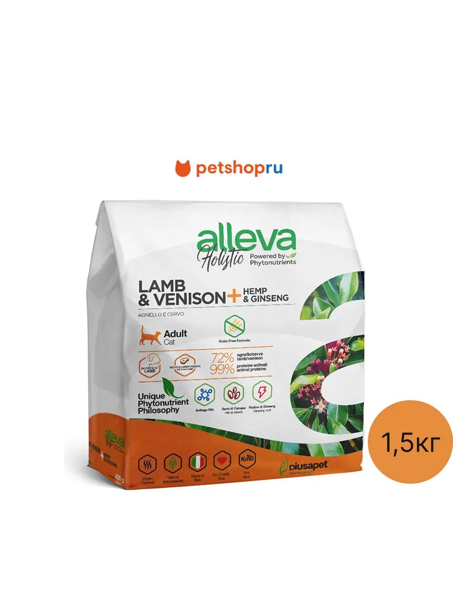 Корм для взрослых кошек Аллева Холистик с ягненком и олениной, коноплей и женьшенем.