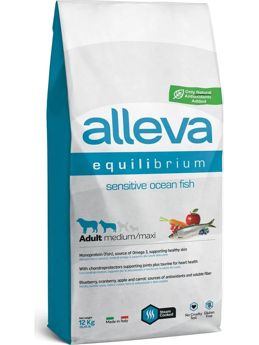 Полное наименование товараСухой корм для взрослых собак средних и крупных пород Alleva Equilibrium Sensitive, океаническая рыба с рисом, суперпремиум, при чувствительном пищеварении, 12 кг