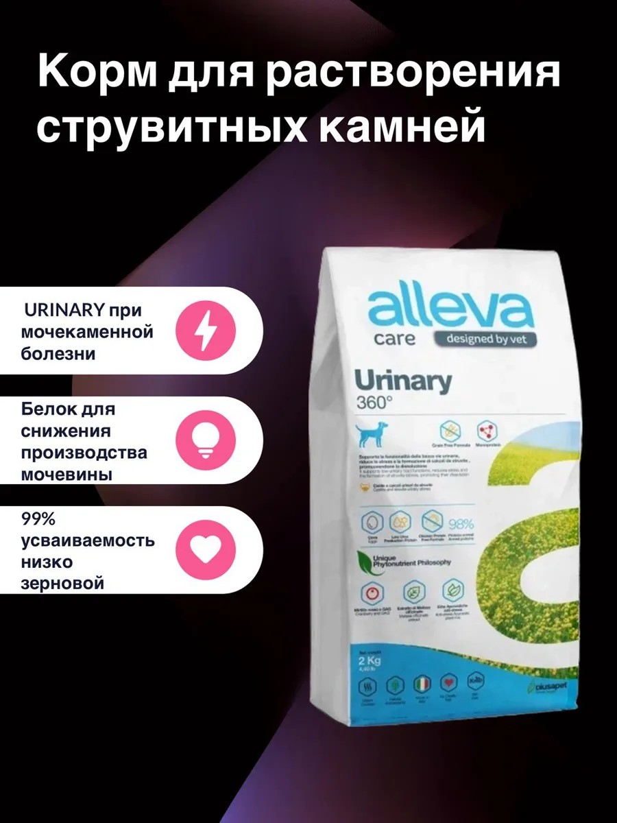Alleva Care Urinary 360°Alleva Care Urinary 360° is a complete dry dietetic food for adult dogs, designed to dissolve struvite stones and prevent their recurrence, as well as to maintain the health of the lower urinary tract. General characteristics. Alleva Care Urinary 360° contains a moderate amount of high-quality proteins (whole eggs) to reduce the formation of urea; it has moderate urine-concentrating properties due to low concentrations of magnesium, phosphorus and increased sodium levels, as well as acidifying properties to modulate urine pH due to the use of calcium sulfate and DL-methionine; these characteristics create an unfavorable environment for the formation of struvite stones. The product contains a large amount of glucosamine, a source of glycosaminoglycans (GAGs), chondroitin sulfate and dried cranberries, which are beneficial for the health of the urinary tract.