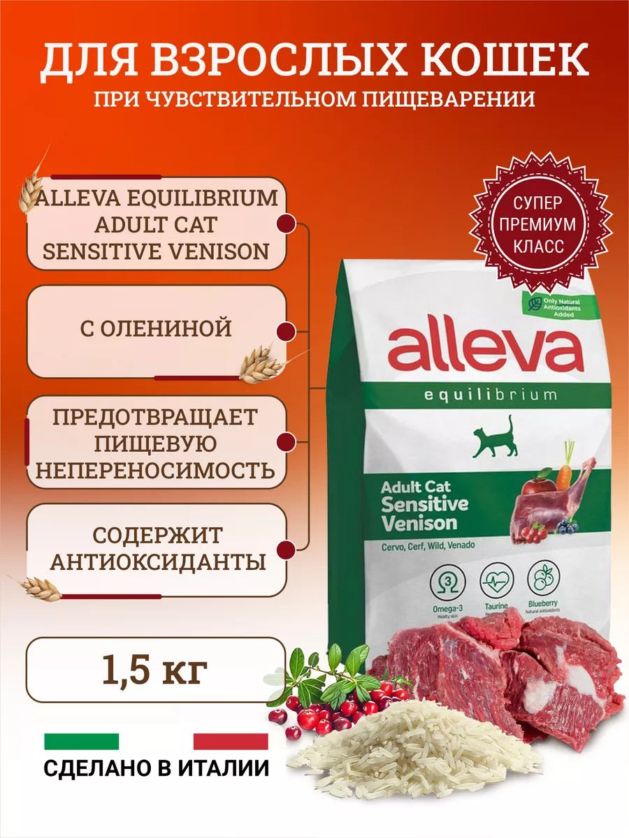 | Комплектация | Alleva Equilibrium Sensitive сухой корм для кошек, с олениной - 1 шт. х 1.5 кг. |