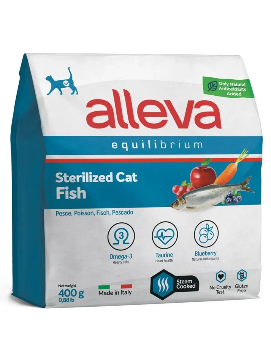 Полнорационный сухой корм для взрослых стерилизованных кошек и кастрированных котов Аллева Эквилибриум с рыбой.