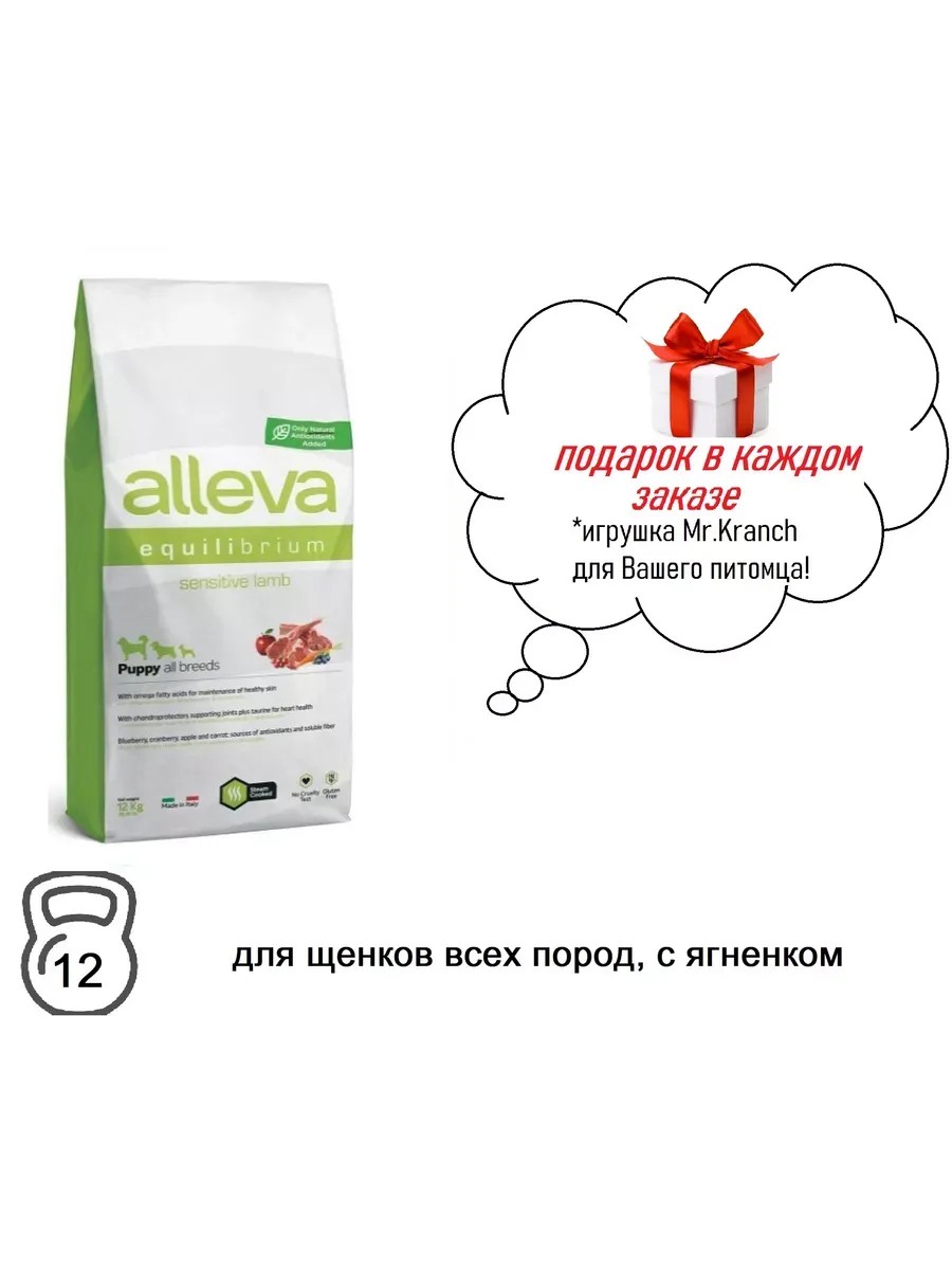 ALLEVA для собак ALLEVA EQUILIBRIUM SENSITIVE LAMB PUPPY ALL BREEDS 12 KG Аллева Корм для щенков всех пород Эквилибриум Сенситив с ягненком 12 кг. Продукт приготовлен на пару для максимальной сохранности качества ингредиентов. В состав кормов Alleva Equilibrium добавлены фрукты и овощи, которые выполняют роль дополнительного источника растворимой клетчатки, витаминов и минералов, а также природных антиоксидантов, обеспечивающих свежесть корма на протяжении всего срока годности. В составе кормов содержится как свежее, так и дегидрированное мясо, что гарантирует превосходный вкус и высокое качество белков животного происхождения. Источники жиров подвергаются строгому контролю: рыбий и куриный жир сохраняются при помощи использования природных антиоксидантов, проходят проверку, также проводится полный анализ незаменимых жирных кислот, чтобы гарантировать оптимальный баланс Омега-6 и Омега-3. Бурый рис — источник углеводов — проходит тщательный отбор и обладает низким гликемическим индексом, который важен для снижения нагрузки на поджелудочную железу и профилактики сахарного диабета. Дополнительно формула кормов обогащена таурином и L-карнитином для поддержания работы основных систем организма, а также хондроитином и глюкозамином для здоровья суставов. Питательные вещества сырой протеин – 30,00%, сырой жир – 20,00%, сырая клетчатка – 1,50%, сырая зола – 7,50%, Кальций – 1,40%, Фосфор – 0,90%, Омега-6 – 1,50%, Омега-3 – 0,30%, глюкозамин – 500 мг/кг