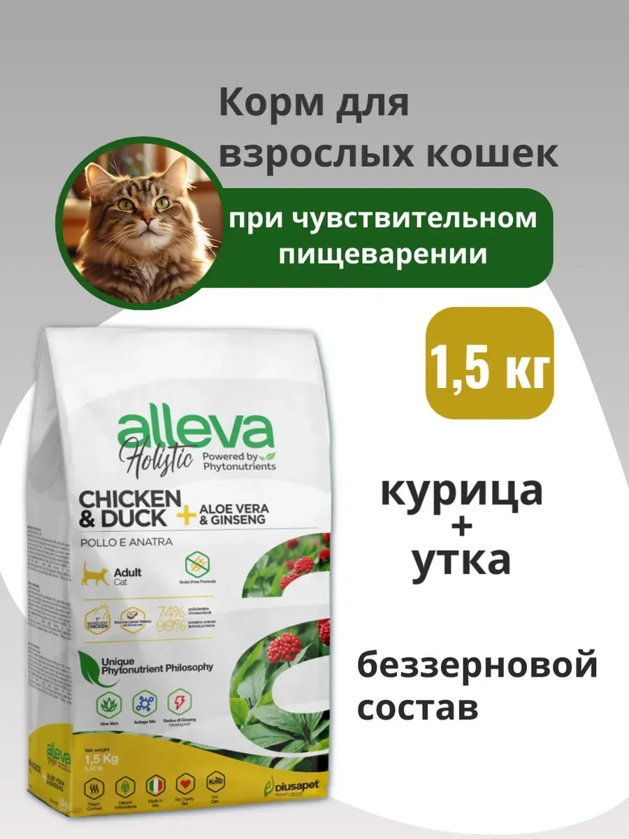 Сухой беззерновой корм Alleva Holistic Cat Adult Chicken&Duck для взрослых кошек с курицей и уткой, 1,5 кг - это полнорационный корм, разработанный специально для взрослых котов и кошек старше 1 года. Основной ингредиент - дегидрированная курица (42 %) и свежая курица без костей (20 %), которые являются отличным легкоусвояемым белком. Дегидрированная утка (12 %) является дополнительным источником животного белка в корме, богатого полезными аминокислотами. В составе корма также присутствуют батат, гороховый крахмал и волокна гороха, которые способствуют правильному пищеварению. Рыбий жир является легкоусвояемым источником незаменимых жирных кислот, а куриная печень придает корму дополнительную вкусовую привлекательность. Корень цикория, подорожник и пивные дрожжи стимулируют и поддерживают здоровье кишечной иммунной системы. Куриные хрящи, алое вера, женьшень и другие натуральные ингредиенты укрепляют иммунитет, поддерживают здоровье костей и суставов, а также помогают контролировать массу тела и повышают выносливость. Корм Alleva Holistic Cat Adult Chicken&Duck имеет энергетическую ценность 4045 ккал/кг, что делает его питательным и сбалансированным. Витамины А, D3, Е, B1, B2, B6, B12, ниацинамид, биотин, фолиевая кислота и другие минералы обеспечивают полноценное питание для вашего питомца. Корм упакован в пакет весом 1,5 кг и предназначен для хранения в сухом месте. Выбирая сухой беззерновой корм Alleva Holistic Cat Adult Chicken&Duck для взрослых кошек, вы обеспечиваете своему питомцу полноценное питание, здоровье и благополучие.