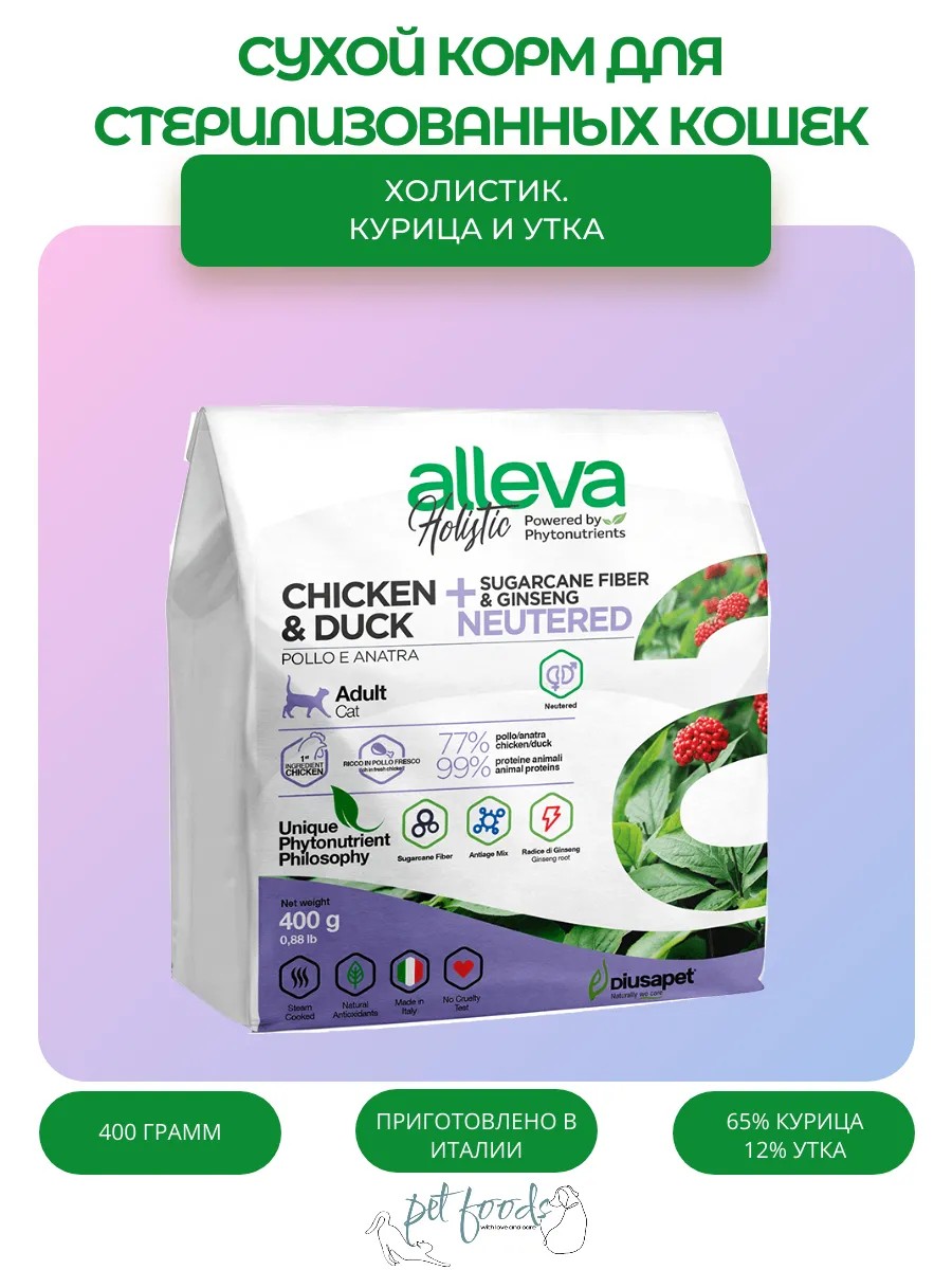 Сухой беззерновой корм Alleva Holistic Cat Neutered Chicken&Duck для стерилизованных кошек с курицей и уткой.