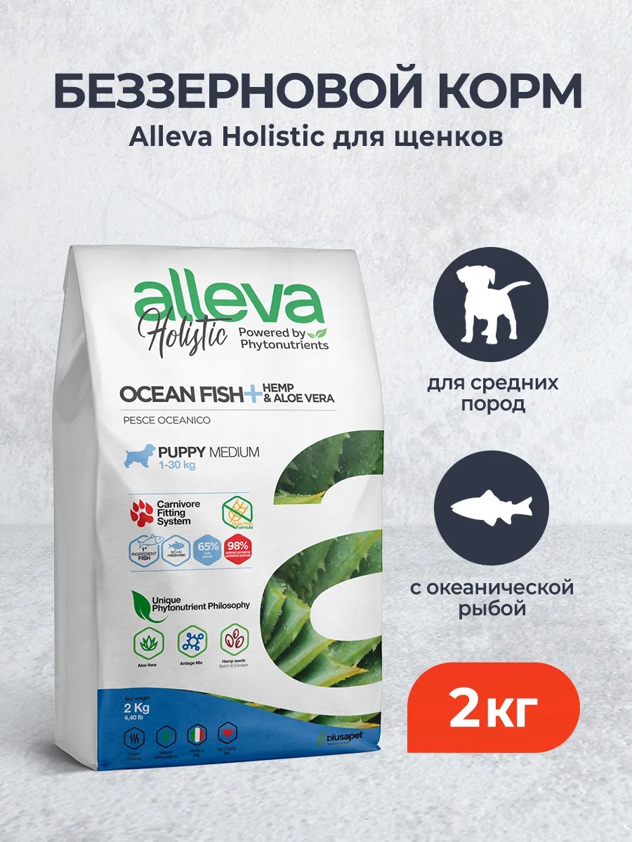 | Полное наименование товара | Alleva Holistic Puppy/Junior Ocean Fish Medium сухой корм для щенков средних пород с океанической рыбой, коноплей и алое вера 2 кг |