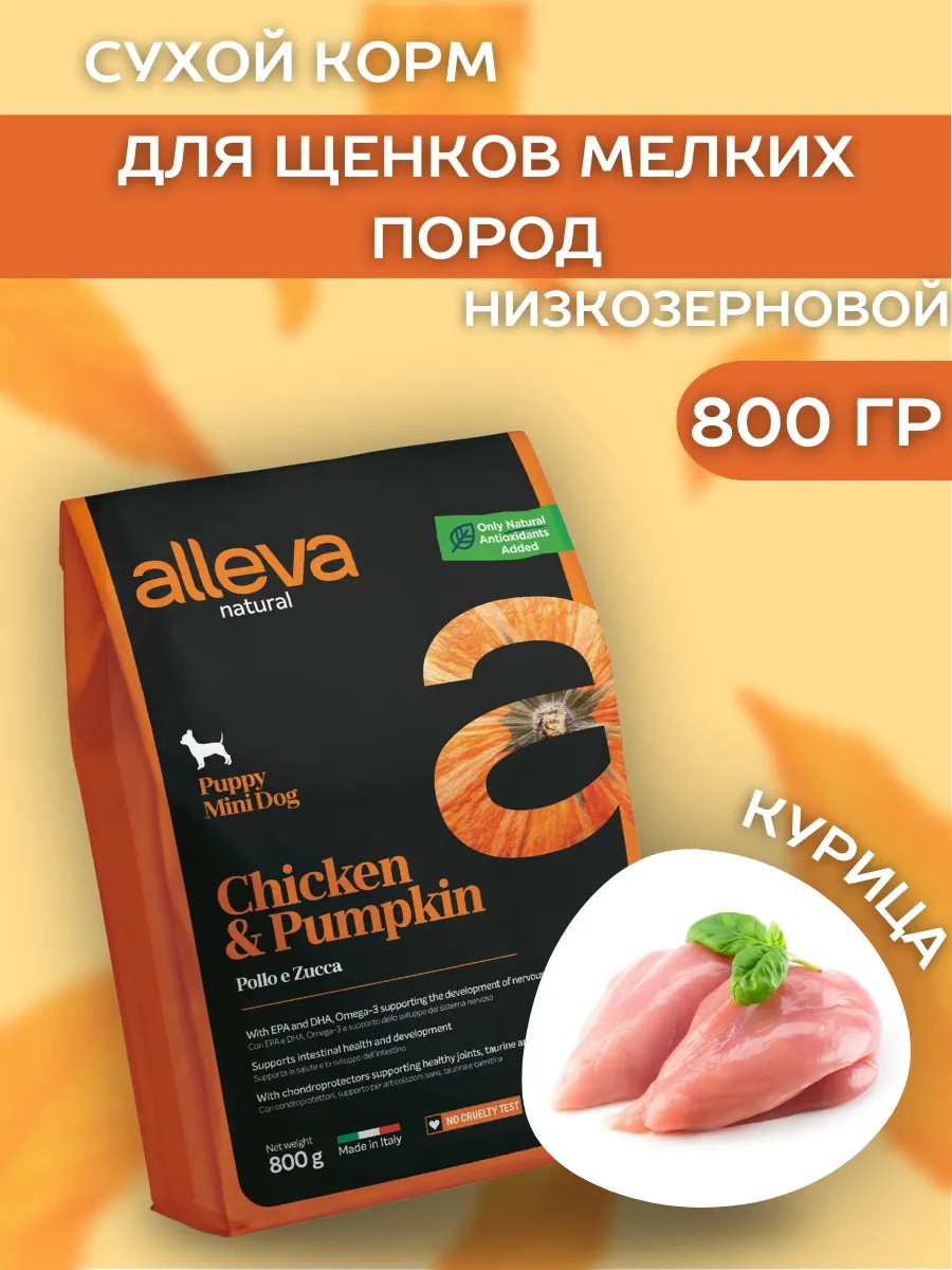Alleva Низкозерновой корм для щенков мелких пород с курицей 800 г