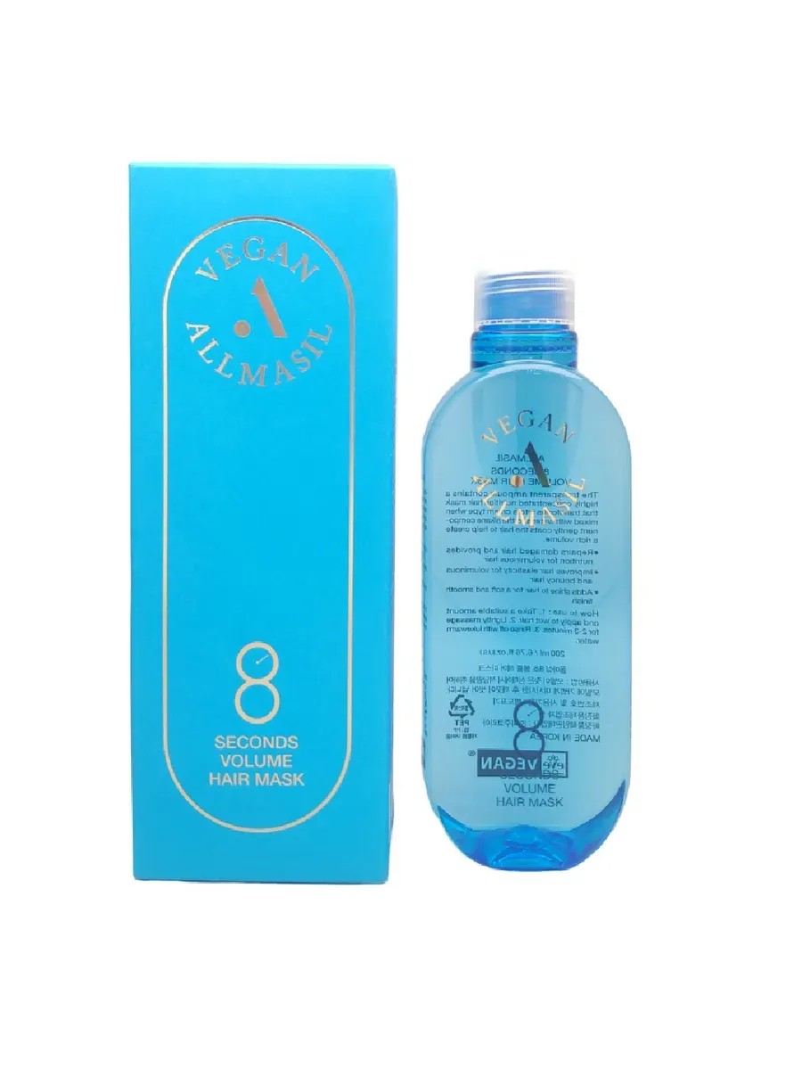 AllMasil. 8 Seconds Volume Hair Mask, 200 ml. A highly concentrated hair mask that turns into a cream when mixed with water and gently envelops hair, adding volume. It restores damaged hair, nourishes, and adds volume. It increases elasticity, making it bouncy and voluminous. It adds shine, softness, and smoothness. Directions: Apply the mask to damp hair after shampooing, distribute evenly over the entire length using rubbing movements, leave on for 8 seconds (it is permissible to leave the mask on for 3-5 minutes for severely damaged hair), and rinse with warm water.