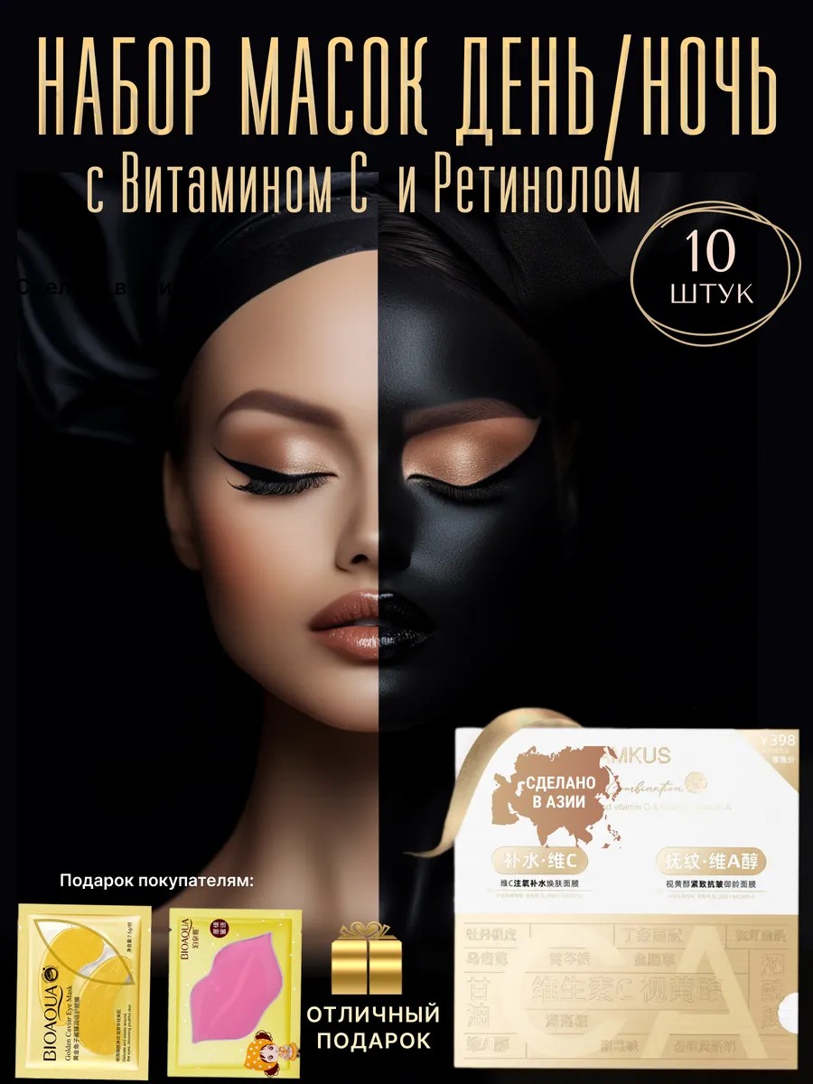 Набор тканевых масок для лица "День/Ночь" состоит из 10 шт, из которых 5 с главным действующим веществом - Витамином С, и 5 - с Ретинолом.
