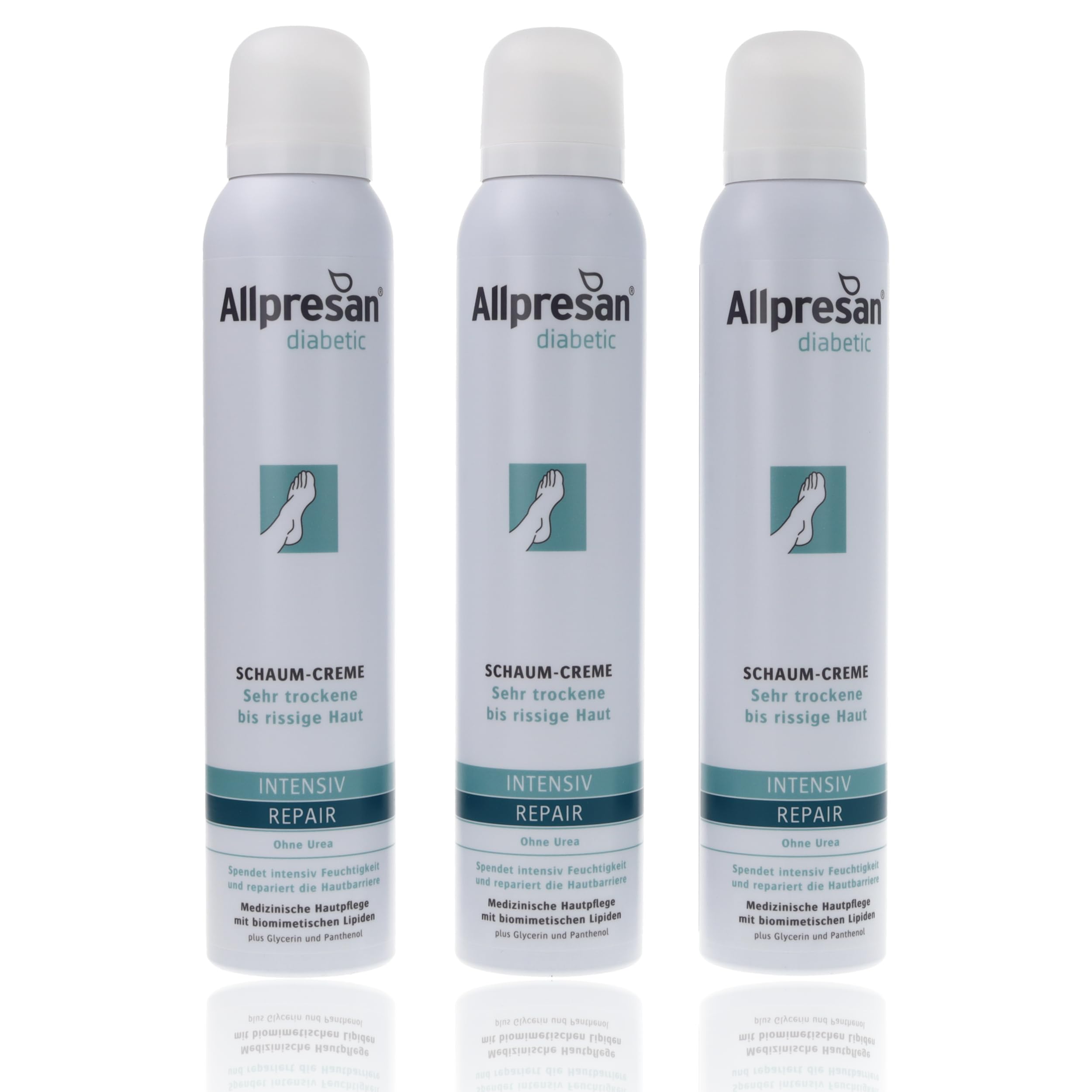 Allpresan Intensive Repair diabetic foam, free of urea, has been developed for the daily care of very dry and cracked skin associated with diabetes. The foaming cream intensely moisturizes the skin on the feet and legs. The patented technology with biomimetic lipids strengthens the skin's natural barrier to prevent moisture loss. The foaming cream is specially formulated to meet the needs of diabetic skin. Benefits at a glance: - With biomimetic lipids. Forms a breathable protective layer without compromising the skin's natural functions. Absorbs quickly. Textiles can be put back on immediately after application (e.g., compression stockings). Fragrance-free, dye-free, and preservative-free. DIRECTIONS FOR USE Ideally, Allpresan Intensive Repair Diabetic Foaming Cream should be applied twice a day (morning and evening) or as needed to very dry to flaky skin for optimal diabetic skin care. A small amount is sufficient for large areas of skin. Allpresan Intensive Repair Diabetic Foaming Cream absorbs quickly and is non-greasy, so clothing can be put on immediately. This product is for external use only. Shake the foaming cream container well before use and hold it upright when removing it. Before first use, you must break the tamper-evident seal on the back of the foam head. SAFETY WARNING Keep the container tightly closed. Keep away from heat, hot surfaces, sparks, open flames, and other ignition sources. No smoking. Do not spray near a flame or other ignition source. See moreBenefits: Vegan - 100 cruelty-free (as required by law) - Made in Germany - Free from PEGs, silicones, parabens, microplastics, dyes, and preservatives - Urea-free - Absorbs quickly. [Easy to use] Shake, hold upright, lather. Apply 1 to 2 times daily to the affected skin. Up to twice as economical as comparable emulsions. Repairing technology: Thanks to special repairing technology, the foaming cream repairs the skin barrier in just 4 weeks and promotes skin regeneration. Result: Excess moisture loss is effectively counteracted. Nourishing ingredients: Glycerin intensely and gently moisturizes dry skin. In addition, panthenol soothes sensitive and irritated skin on the feet and legs. Effective care: Medical-grade skincare for the daily care of sensitive skin on the feet and legs associated with diabetes. Contains biomimetic lipids, panthenol and glycerin, without urea.Allpresan Lot de 3 crèmes moussantes diabetic Intensiv Repair sans urée - En cas de diabète sucré - Pour peaux très sèches à craquelées - 200 mlDESCRIPTION DU PRODUIT DESCRIPTION DU PRODUIT La mousse diabétique Allpresan Intensive Repair sans urée a été développée pour le soin quotidien des peaux très sèches et craquelées en cas de diabète sucré. La crème mousse hydrate intensément la peau des pieds et des jambes. La technologie brevetée avec des lipides biomimétiques renforce la barrière physiologique cutanée pour empêcher l'humidité de s'échapper. La crème moussante est spécialement conçue pour répondre aux besoins des peaux diabétiques. Aperçu des avantages : - Avec des lipides biomimétiques. Forme un filet de protection respirant sans compromettre les fonctions naturelles de la peau. Pénètre rapidement. Les textiles peuvent être remis immédiatement après l'application (par exemple les bas de compression). Sans parfum, sans colorants ni conservateurs. MODE D'EMPLOI Idéalement, la crème mousse diabétique Allpresan Intensive Repair doit être appliquée 2 fois par jour (matin et soir) ou selon les besoins sur les peaux très sèches à squameuses afin de prendre soin de la peau diabétique de manière optimale. Une petite quantité suffit pour les grandes zones de la peau. La mousse diabétique Allpresan Intensive Repair pénètre rapidement et ne graisse pas, de sorte que les vêtements peuvent être directement enfilés. Le produit est uniquement destiné à un usage externe. Veuillez bien secouer la boîte de crème mousse avant utilisation et la maintenir droite lorsque vous la retirez. Avant la première utilisation, vous devez déverrouiller le sceau d'originalité à l'arrière de la tête en mousse. AVERTISSEMENT DE SÉCURITÉ Gardez le récipient bien fermé. Tenir à l'écart de la chaleur, des surfaces chaudes, des étincelles, des flammes nues et d'autres types de sources d'inflammation. Ne pas fumer. Ne pas vaporiser à proximité d'une flamme ou d'une autre source d'inflammation. Voir plusAvantages : Végétalien - 100 sans cruauté envers les animaux (selon la loi) - Fabriqué en Allemagne - Sans PEG, silicones, parabènes, microplastiques, colorants et conservateurs - Sans urée - Pénètre rapidement. [Facile à utiliser] Secouez, tenez droit, faites mousser. Appliquer 1 à 2 fois par jour sur la peau affectée. Jusqu'à deux fois plus économique que des émulsions comparables. Technologie réparatrice : grâce à la technologie spéciale de réparation, la crème mousse répare la barrière cutanée en seulement 4 semaines et favorise la régénération de la peau. Résultat : la perte d'humidité supplémentaire est efficacement contrée. Ingrédients nourrissants : la glycérine hydrate intensément la peau sèche de manière douce. En outre, le panthénol apaise la peau sensible et irritée des pieds et des jambes. Soin efficace : soin médical de la peau pour le soin quotidien de la peau sensible des pieds et des jambes en cas de diabète. Contient des lipides biomimétiques, du panthénol et de la glycérine, sans urée.