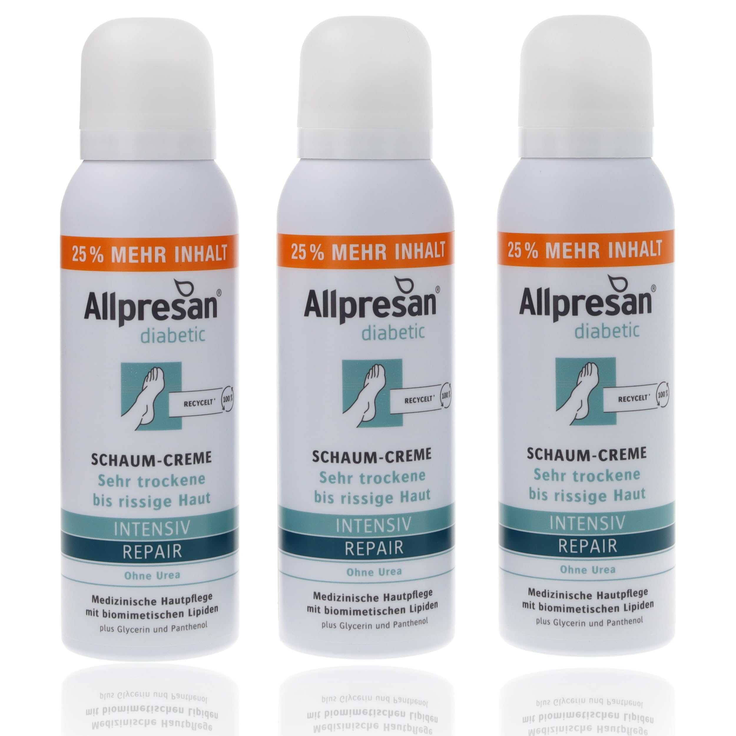 People with diabetes often suffer from dry, itchy skin. Sensitive skin needs care that soothes, moisturizes, and repairs gaps in the skin barrier. Allpresan Diabetic Intensive Repair Urea-Free Foaming Cream has been developed as an ideal basic skincare product for people with diabetes. Glycerin gently and intensely moisturizes dry skin. Panthenol also soothes sensitive and irritated skin. Thanks to its special repair technology, the foaming cream repairs the skin barrier in just 4 weeks and also promotes skin regeneration. The result: further moisture loss is effectively and lastingly counteracted. INSTRUCTIONS FOR USE Ideally, Allpresan Diabetic Intensive Repair Foaming Cream should be applied twice a day (morning and evening) or as needed to very dry to flaky skin to optimally care for diabetic skin. A small amount is sufficient for large areas of skin. Allpresan Intensive Repair Diabetic Foam absorbs quickly and is non-greasy, so clothing can be put on immediately. This product is for external use only. SAFETY WARNING Container is pressurized: may explode if heated. Extremely flammable aerosol. Keep away from heat, hot surfaces, sparks, open flames, and other ignition sources. No smoking. Do not spray near a flame or other ignition source. See moreBenefits: Vegan - 100 cruelty-free (as required by law) - Made in Germany - Free from PEGs, silicones, parabens, microplastics, dyes, and preservatives - Urea-free - Absorbs quickly. [Easy to use] Shake, hold upright, lather. Apply 1 to 2 times daily to the affected skin. Up to twice as economical as comparable emulsions. Repairing technology: Thanks to special repairing technology, the foaming cream repairs the skin barrier in just 4 weeks and promotes skin regeneration. Result: Excess moisture loss is effectively counteracted. Nourishing ingredients: Glycerin intensely and gently moisturizes dry skin. In addition, panthenol soothes sensitive and irritated skin on the feet and legs. Effective care: Specially formulated to combat very dry to cracked skin on the feet and legs in cases of diabetes.Allpresan diabetic Intensif Repair Crème moussante sans urée – Pour le diabète sucré – Pour peaux très sèches à gercées – 125 ml (lot de 3)DESCRIPTION DU PRODUIT DESCRIPTION DU PRODUIT Les personnes atteintes de diabète souffrent souvent de peaux sèches et démangeaisons. Les peaux sensibles ont alors besoin de soins qui apaisent la peau, l'hydratent et comblent les lacunes de la barrière cutanée. La crème moussante Allpresan diabetic Intensive Repair sans urée a été développée comme soin de base idéal pour les personnes atteintes de diabète. La glycérine hydrate intensément les peaux sèches de manière douce. En outre, le panthénol apaise la peau sensible et irritée. Grâce à la technologie spéciale de réparation, la crème mousse répare la barrière cutanée en seulement 4 semaines et favorise également la régénération de la peau. Résultat : la perte d'humidité supplémentaire est efficacement et durablement contrecarrée. MODE D'EMPLOI Idéalement, la crème mousse diabétique Allpresan Intensive Repair doit être appliquée 2 fois par jour (matin et soir) ou selon les besoins sur les peaux très sèches à squameuses afin de prendre soin de la peau diabétique de manière optimale. Une petite quantité suffit pour les grandes zones de la peau. La mousse diabétique Allpresan Intensive Repair pénètre rapidement et ne graisse pas, de sorte que les vêtements peuvent être directement enfilés. Le produit est uniquement destiné à un usage externe. AVERTISSEMENT DE SÉCURITÉ Le récipient est sous pression : peut exploser lorsqu'il est chauffé. Aérosol extrêmement inflammable. Tenir à l'écart de la chaleur, des surfaces chaudes, des étincelles, des flammes nues et d'autres types de sources d'inflammation. Ne pas fumer. Ne pas vaporiser à proximité d'une flamme ou d'une autre source d'inflammation. Voir plusAvantages : Végétalien - 100 sans cruauté envers les animaux (selon la loi) - Fabriqué en Allemagne - Sans PEG, silicones, parabènes, microplastiques, colorants et conservateurs - Sans urée - Pénètre rapidement. [Facile à utiliser] Secouez, tenez droit, faites mousser. Appliquer 1 à 2 fois par jour sur la peau affectée. Jusqu'à deux fois plus économique que des émulsions comparables. Technologie réparatrice : grâce à la technologie spéciale de réparation, la crème mousse répare la barrière cutanée en seulement 4 semaines et favorise la régénération de la peau. Résultat : la perte d'humidité supplémentaire est efficacement contrée. Ingrédients nourrissants : la glycérine hydrate intensément la peau sèche de manière douce. En outre, le panthénol apaise la peau sensible et irritée des pieds et des jambes. Soin efficace : spécialement conçu pour lutter contre les peaux très sèches à gercées des pieds et des jambes en cas de diabète.