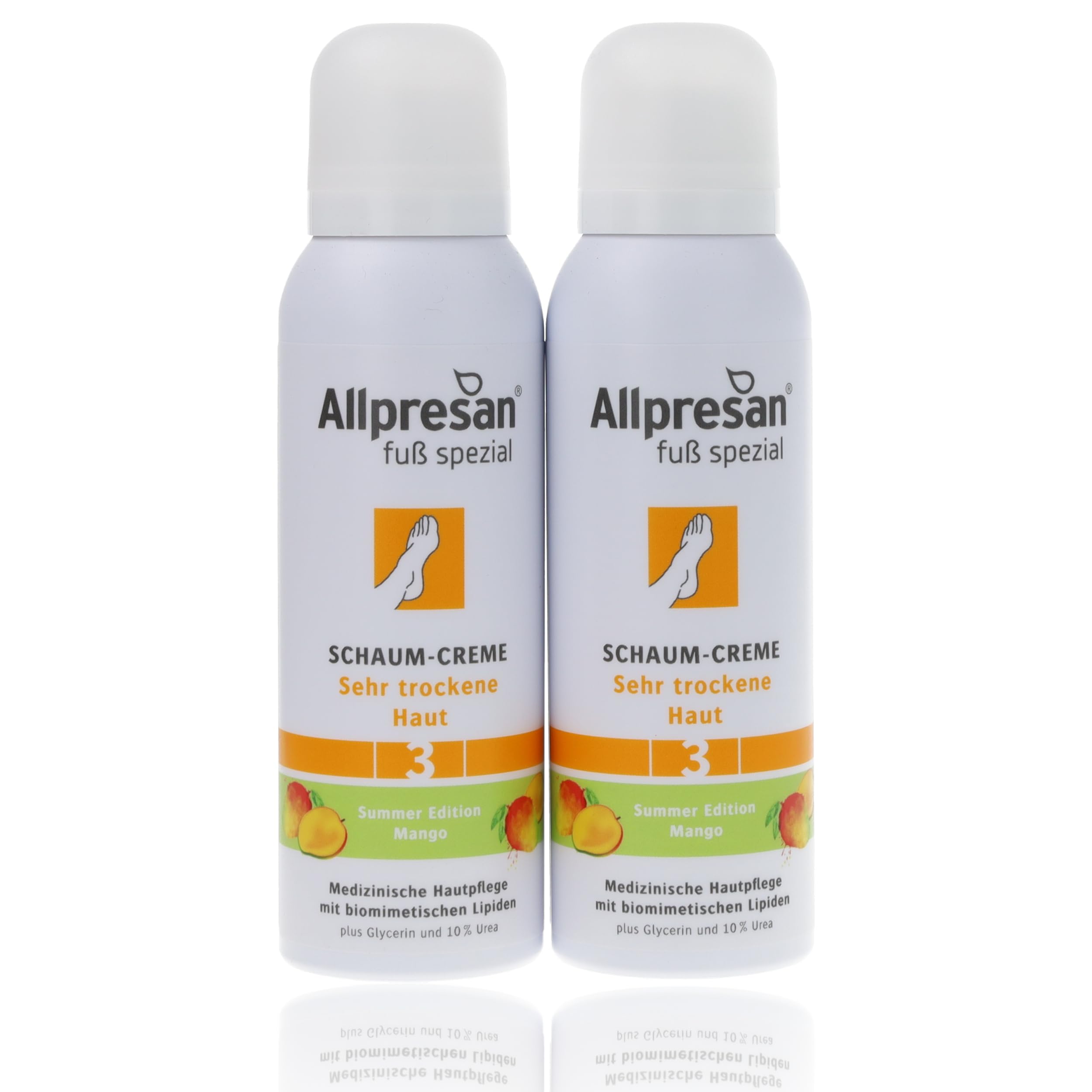 Very dry skin on the feet is characterized by roughness, cracks, and keratinization, providing a perfect entry point for bacteria and other microorganisms that can lead to inflammation and fungal infections. Our classic foaming cream, Allpresan Foaming Foot Cream No. 3 for very dry skin, now offers an improved formula with biomimetic (skin-like) lipids. Specially designed for the daily care of very dry skin, this lipid foaming cream with 10 urea intensely moisturizes, thus reducing roughness, cracks, and keratinization. Mango fragrance. How to use: Ideally, Allpresan Foaming Foot Cream No. 3 should be applied twice a day (morning and evening) or as needed to dry areas of the skin to optimally care for the skin on your feet. Thanks to BarrioExpert technology, this foaming cream is particularly economical – a small amount is enough for large areas of skin. Allpresan No. 3 Special Foot Foaming Cream absorbs quickly and is non-greasy, so you can put on your clothes immediately. This product is for external use only. Shake the foaming cream container well before use and hold it upright when removing it. Before first use, break the tamper-evident seal on the back of the foam head. INGREDIENTS Aqua, Urea, Butane, Decyl Oleate, Octyldodecanol, Glycerin, Cetearyl Alcohol, Propane, Stearic Acid, Glyceryl Stearate, Olea Europaea Fruit Oil, Caprylyl Glycol, Sodium Lauroyl Sarcosinate, Capryloyl Glycine, Caprylic Capric Triglyceride, Butyrospermum Parkikide. i butter, potassium um Lauroyl Wheat Amino Acids, Allantoin, Parfum, Palm Glycerides, Hydrogenated Lecithin, Ceramide NP, Squalane, Pentylene Glycol, Tocopherol, Hydrogenated Palm Glycerides Citrate, Linalool, Hexyl Cinnamal, Limonene.Product volume: 125 ml. [Easy to use] Shake, hold upright, and lather: correct application provides a complete lathering cream experience, reaching every last stain. Apply twice daily to very dry skin. [Pleasant application] The lathering cream absorbs quickly and leaves a pleasant feeling of softness on the skin, without a greasy residue. Clothing can be put back on immediately after application. Repairing technology: The biomimetic lipids in Allpresan lathering creams fit like puzzle pieces into the spaces of the skin barrier, thus promoting its regeneration. The skin's natural protective function is restored. [Visible effect] With regular use of Allpresan lathering cream, skin is more supple and softer, and the formation of calluses is reduced. Optimal care: Medical-grade skincare with biomimetic lipids plus glycerin and 10 urea for intense and long-lasting hydration with a mango fragrance.Allpresan Crème moussante pour les pieds - Parfum mangue - Pour les peaux très sèches - Pour le soin quotidien des pieds très secs - 2 x 125 ml 125 ml (2 erPack) mangueDESCRIPTION DU PRODUIT DESCRIPTION DU PRODUIT Les peaux très sèches des pieds se caractérisent par leur rugosité, leurs fissures et leur kératinisation et offrent ainsi une porte d'entrée parfaite pour les bactéries et autres micro-organismes qui peuvent entraîner des inflammations et des infections fongiques. Notre crème moussante classique, la crème moussante Allpresan pour les pieds n 3 pour les peaux très sèches offre désormais une formule améliorée avec des lipides biomimétiques (apparentés à la peau). Spécialement conçue pour le soin quotidien des peaux très sèches, la crème mousse lipidique avec 10 d'urée hydrate intensément et réduit ainsi la rugosité, les gerçures et les kératinisations. Parfum mangue. Comment utiliser: Idéalement, la crème mousse spéciale Allpresan n 3 pour les pieds doit être appliquée 2 fois par jour (matin et soir) ou selon les besoins sur les zones sèches de la peau afin de prendre soin de la peau des pieds de manière optimale. Grâce à la technologie BarrioExpert, la crème moussante est particulièrement économique – une petite quantité suffit déjà pour les grandes zones de la peau. La crème mousse spéciale pour pieds Allpresan n 3 pénètre rapidement et ne graisse pas, de sorte que les vêtements peuvent être directement enfilés. Le produit est uniquement destiné à un usage externe. Veuillez bien secouer la boîte de crème mousse avant utilisation et la maintenir droite lorsque vous la retirez. Avant la première utilisation, vous devez déverrouiller le sceau d'originalité à l'arrière de la tête en mousse INGRÉDIENTS Aqua, Urea, Butane, Decyl Oleate, Octyldodecanol, Glycerin, Cetearyl Alcohol, Propane, Stearic Acid, Glyceryl Stearate, Olea Europaea Fruit Oil, Caprylyl Glycol, Sodium Lauroyl Sarcosinate, Capryloyl Glycine, Caprylic Capric Triglyceride, Butyrospermum Parkikide. i beurre, potassique um Lauroyl Wheat Amino Acids, Allantoïne, Parfum, Palm Glycerides, Hydrogenated Lécithin, Ceramide NP, Squalane, Pentylene Glycol, Tocopherol, Hydrogenated Palm Glycerides Citrate, Linalool, Hexyl Cinnamal, Limonene.Volume de l'article : 125 ml. [Facile à utiliser] Secouez, maintenez-le droit, faites mousser : l'application correcte offre une expérience de crème moussante complète jusqu'à la dernière tache appliquer 2 fois par jour sur la peau très sèche. [Application agréable] La crème moussante pénètre rapidement et laisse une agréable sensation de douceur sur la peau, sans film gras. Les vêtements peuvent être remis directement après l'application. Technologie réparatrice : les lipides biomimétiques contenus dans les crèmes moussantes Allpresan se placent comme des particules de puzzle ajustées dans les espaces de la barrière cutanée et favorisent ainsi leur régénération. La fonction protectrice naturelle de la peau est restaurée. [Effet visible] Grâce à l'utilisation régulière de la crème mousse Allpresan la peau est plus souple et plus douce, et la formation de callosités est réduite. Soin optimal : soin médical pour la peau avec lipides biomimétiques plus glycérine et 10 d'urée pour une hydratation intense et durable avec parfum de