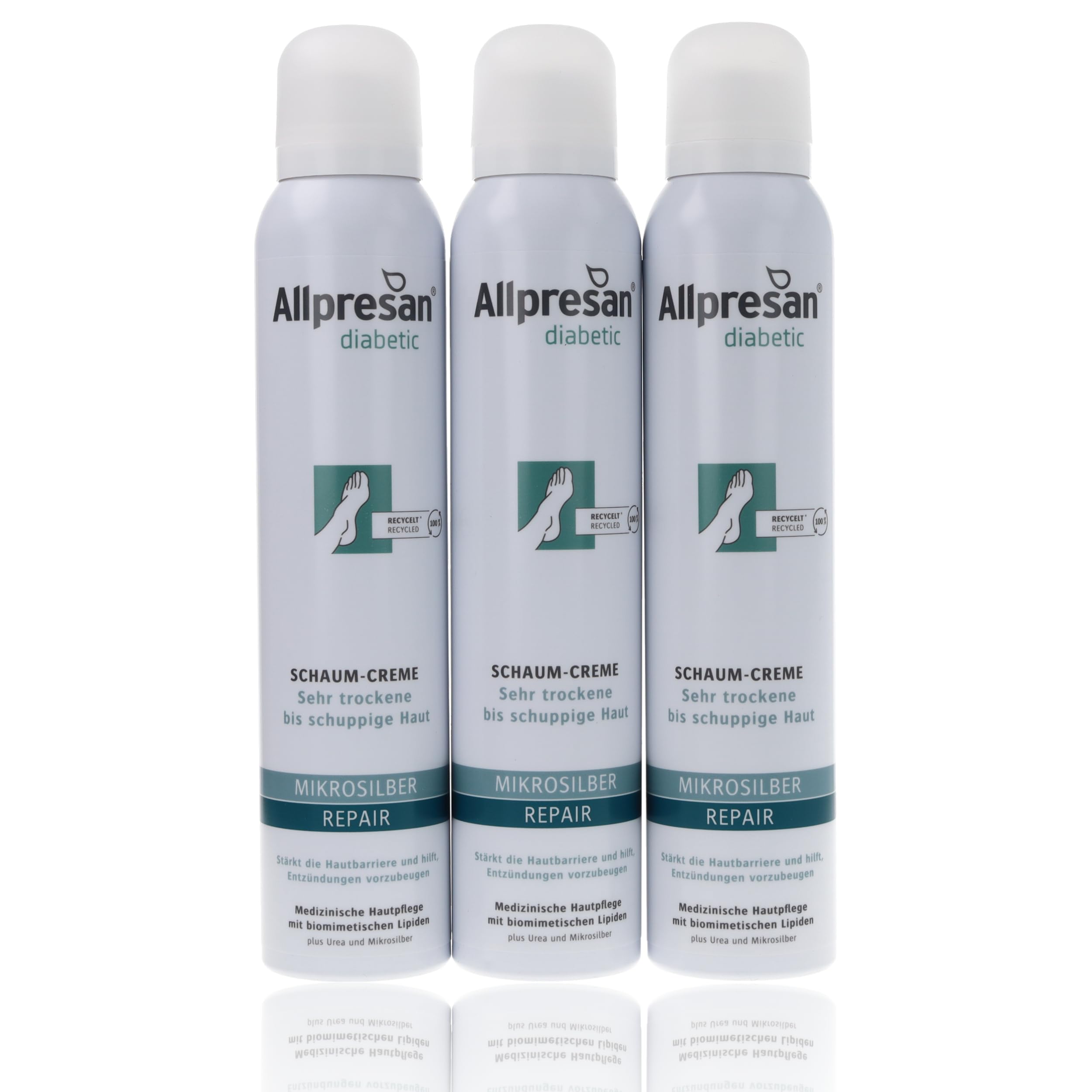 Very dry to flaky skin is a common symptom of diabetes. Studies have shown that the skin barrier in diabetics is compromised, and this can often be the starting point for serious foot complications. Indeed, when the skin barrier is compromised, the risk of penetration of germs and microorganisms, and the resulting infections, is significantly increased. Allpresan Diabetic Microsilver Repair Foaming Cream has been specially formulated for skin care in diabetics. Thanks to biomimetic lipids and urea, the skin barrier is strengthened and intensely moisturized. Microsilver has antibacterial properties and thus helps prevent inflammation. DIRECTIONS FOR USE Ideally, Allpresan Diabetic Foaming Foam should be applied twice a day (morning and evening) or as needed to very dry to flaky skin for optimal diabetic skin care. A small amount is sufficient for large areas of skin. Allpresan Diabetic Foaming Foaming Cream MICROSILBER REPAIR absorbs quickly and is non-greasy, so clothing can be put on immediately. SAFETY WARNING Container is pressurized: may explode if heated. Extremely flammable aerosol. Keep away from heat, hot surfaces, sparks, open flames, and other ignition sources. No smoking. Do not spray near a flame or other ignition source. See moreBenefits: Vegan 100 cruelty-free (as required by law) Made in Germany Free from PEGs, silicones, parabens, microplastics, dyes, and preservatives. [Easy to use] Shake, hold upright, lather. Apply 1-2 times daily to the affected skin. [Valuable ingredients] Biomimetic (skin-like) lipids and urea strengthen the skin barrier and intensely moisturize the skin. Micro-silver has antibacterial properties and helps prevent inflammation. Effective care: Medical skin care for very dry to flaky feet and legs in diabetics. Contains biomimetic lipids, urea, and nano-certified micro-silver.Allpresan Lot de 3 crèmes diabétiques en micro-argent crème réparatrice avec micro-argent pour peaux très sèches à squameuses en cas de diabète sucré - 200 mlDESCRIPTION DU PRODUIT DESCRIPTION DU PRODUIT Les peaux très sèches à squameuses sont un phénomène commun de la maladie du diabète. Des études ont montré que la barrière cutanée chez les diabétiques est perturbée et que cela peut souvent être le point de départ de graves complications du pied. En effet, en cas de défaillance de la barrière cutanée, le risque de pénétration des germes et des micro-organismes et des infections qui en résultent est considérablement augmenté. La crème moussante Allpresan diabetic Microargent Repair a été spécialement conçue pour le soin de la peau en cas de diabète. Grâce aux lipides biomimétiques et à l'urée, la barrière cutanée est renforcée et intensément hydratée. Le micro-argent possède des propriétés antibactériennes et aide ainsi à prévenir les inflammations. MODE D'EMPLOI Idéalement, la mousse diabétique Allpresan doit être appliquée en micro-argent réparateur 2 fois par jour (matin et soir) ou selon les besoins sur les peaux très sèches à squameuses afin de prendre soin de la peau diabétique de manière optimale. Une petite quantité suffit pour les grandes zones de la peau. La crème moussante diabétique Allpresan MICROSILBER REPAIR pénètre rapidement et ne graisse pas, de sorte que les vêtements peuvent être directement enfilés. AVERTISSEMENT DE SÉCURITÉ Le récipient est sous pression : peut exploser lorsqu'il est chauffé. Aérosol extrêmement inflammable. Tenir à l'écart de la chaleur, des surfaces chaudes, des étincelles, des flammes nues et d'autres types de sources d'inflammation. Ne pas fumer. Ne pas vaporiser à proximité d'une flamme ou d'une autre source d'inflammation. Voir plusAvantages : végétalien 100 sans cruauté envers les animaux (selon la loi) fabriqué en Allemagne sans PEG, silicones, parabènes, microplastiques, colorants et conservateurs. [Facile à utiliser] Secouez, tenez droit, faites mousser. Appliquer 1 à 2 fois par jour sur la peau affectée. [Ingrédients précieux] Les lipides biomimétiques (apparentés à la peau) et l'urée renforcent la barrière cutanée et hydratent intensément la peau. Le micro-argent possède des propriétés antibactériennes et aide à prévenir l'inflammation. Soin efficace : soin médical de la peau pour les pieds et les jambes très sèches à squameuses en cas de diabète. Contient des lipides biomimétiques, de l'urée et du micro-argent certifié sans nano.
