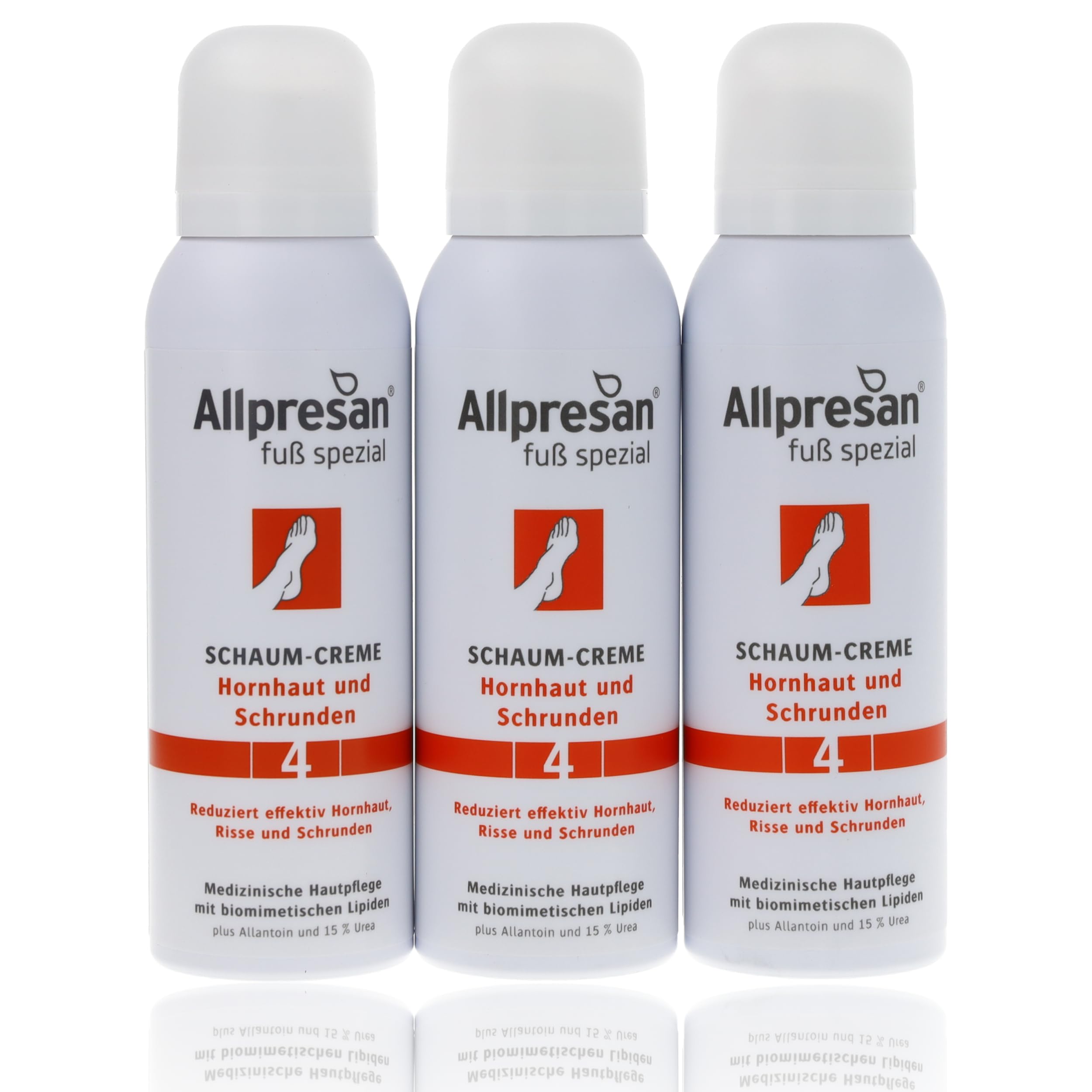 Our feet carry us throughout our lives and deserve effective care. Allpresan Foot Special offers a wide range of products for everyday and specific foot problems and stands for solution-oriented foot care. BarrioExpert technology forms a breathable protective mesh on the skin, inspired by the principles of modern textiles. Allpresan Foot Special Foam Cream No. 4 provides specially tailored care for calloused skin and acts in a targeted way against superficial keratinization and cracks. The ease of use of the rich, fast-absorbing foam cream transforms foot care sleeves into true pampering enthusiasts. Product Features: Foaming cream for calluses and cracks on the feet. - For the daily care of calloused feet. Acts in a targeted way against superficial keratinization and cracks. Forms a breathable protective mesh. - Clothing can be put back on immediately after application. No risk of slipping. Fragrance-free, dye-free, and preservative-free. How to use: Ideally, Allpresan Special Foot Foam No. 4 should be applied twice a day (morning and evening) or as needed to calloused areas of the skin to optimally care for the skin on your feet. Thanks to Allpresan's foaming cream technology, it is particularly economical – a small amount is sufficient for large areas. Allpresan Special Foot Foam No. 4 absorbs quickly and is non-greasy, so you can put on your clothes immediately afterward. The product is for external use only. Please shake the foam cream container well before use and hold it upright when removing it. Before first use, you must break the tamper-evident seal on the back of the foam applicator. DIRECTIONS FOR USE Ideally, Allpresan No. 4 Special Foot Foam Cream should be applied twice a day (morning and evening) or as needed to calloused areas of the skin to optimally care for the skin on your feet. SAFETY WARNING Container is pressurized: may explode when heated. Keep away from heat, hot surfaces, sparks, open flames, and other ignition sources. No smoking. See moreContents: 3 x 125 ml Allpresan Foot Special Foaming Cream No. 4 For calluses and cracks Fragrance-free, colorant-free, and preservative-free Contains 15 urea. Shake, hold in place, lather: correct application provides a complete foaming cream experience, reaching every last spot. Apply twice daily to hardened areas of skin. The foaming cream absorbs very quickly without leaving an unpleasant greasy film, is very economical, and can be applied to the skin with almost no contact. Daily care for calloused skin: the light, airy formula based on Barrio-Expert technology forms a breathable protective barrier that reinforces the skin's natural protective function. The foaming cream can naturally reduce calluses and cracks on the feet and prevent the formation of new ones.Allpresan Crème mousse spéciale pour pieds n 4 - Pour callosités et crevasses - Soin quotidien des peaux callosées - 3 x 125 mlDESCRIPTION DU PRODUIT DESCRIPTION DU PRODUIT Nos pieds nous portent tout au long de la vie et méritent des soins efficaces. Allpresan Foot Special offre une large gamme pour les problèmes quotidiens et spécifiques des pieds et est synonyme de soins des pieds orientés vers les solutions. La technologie BarrioExpert forme sur la peau un filet de protection respirant inspiré du principe d'action des textiles modernes. Ainsi, la crème mousse spéciale pour pieds Allpresan n 4 offre un soin spécialement adapté aux besoins de la peau calleuse et agit de manière ciblée contre les kératinisations superficielles et les fissures. Le confort d'utilisation de la crème moussante riche et à absorption rapide transforme les manchons de soin de véritables fans de soins. Caractéristiques du produit : Crème moussante pour callosités et crevasses sur les pieds. - Pour le soin quotidien de la peau des pieds cornée. Agit de manière ciblée contre les kératinisations superficielles et les fissures. Forme un filet de protection respirant. - Les textiles peuvent être remis immédiatement après l'application. Aucun risque de glissement. Sans parfum, sans colorants ni conservateurs. Comment utiliser: Idéalement, la crème mousse spéciale Allpresan pour pieds n 4 doit être appliquée 2 fois par jour (matin et soir) ou selon les besoins sur les zones callisées de la peau afin de prendre soin de la peau des pieds de manière optimale. Grâce à la technologie de crème moussante Allpresan elle est particulièrement économique – une petite quantité suffit déjà pour les grandes zones de la peau. La crème mousse spéciale pour pieds Allpresan n 4 pénètre rapidement et ne graisse pas, de sorte que les vêtements peuvent être directement enfilés. Le produit est uniquement destiné à un usage externe. Veuillez bien secouer la boîte de crème mousse avant utilisation et la maintenir droite lorsque vous la retirez. Avant la première utilisation, vous devez déverrouiller le sceau d'originalité à l'arrière de la tête en mousse. MODE D'EMPLOI Idéalement, la crème mousse spéciale pour pieds Allpresan n 4 doit être appliquée 2 fois par jour (matin et soir) ou selon les besoins sur les zones callisées de la peau afin de prendre soin de la peau des pieds de manière optimale AVERTISSEMENT DE SÉCURITÉ Le récipient est sous pression : peut exploser lorsqu'il est chauffé. Tenir à l'écart de la chaleur, des surfaces chaudes, des étincelles, des flammes nues et d'autres sources d'inflammation. Ne pas fumer Voir plusContenu de la livraison : 3 x 125 ml de crème mousse Allpresan Foot spéciale n 4 Contre les callosités et les crevasses Sans parfum, sans colorants ni conservateurs Contient 15 d'urée. Secouer, maintenir en place, faire mousser : l'application correcte offre une expérience de crème moussante complète jusqu'à la dernière tache appliquer 2 fois par jour sur les zones de peau cornées. La crème moussante pénètre très rapidement sans laisser de film gras désagréable, elle est très économique et peut ê