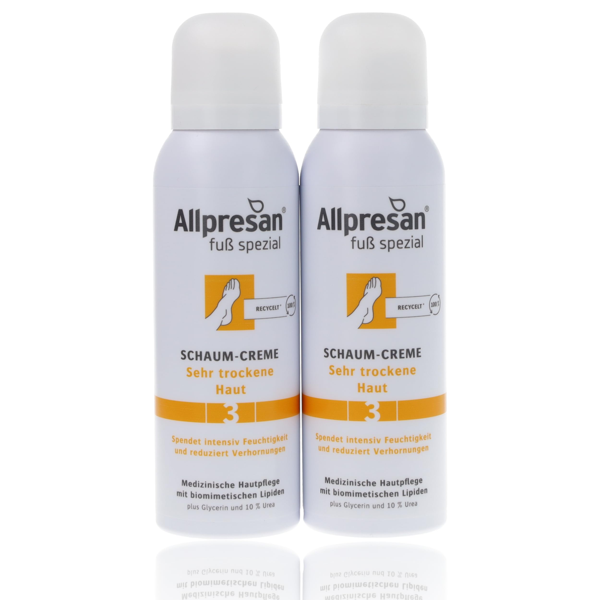 Very dry skin on the feet is characterized by roughness, cracking, and keratinization, providing a perfect entry point for bacteria and other microorganisms that can lead to inflammation and fungal infections, among other things. The perfect solution is our classic foaming cream, Allpresan Special Foot Cream No. 3 for very dry skin – now with an improved formula containing biomimetic (skin-like) lipids. Specially designed for the daily care of very dry feet, the lipid foam with 10 urea intensely moisturizes and also reduces roughness, cracking, and keratinization. INGREDIENTS Aqua, Urea, Butane, Decyl Oleate, Octyldodecanol, Glycerin, Cetearyl Alcohol, Propane, Stearic Acid, Glyceryl Stearate, Olea Europaea Fruit Oil, Caprylyl Glycol, Sodium Lauroyl Sarcosinate, Capryloyl Glycine, Caprylic Capric Triglyceride, Butyrospermum Park butter kii kii butter, potassium Lauroyl Wheat Amino Acids, Allantoin, Palm Glycerides, Hydrogenated Lecithin, Ceramide NP, Squalane, Pentylene Glycol, Hydrogenated Palm Glycerides Citrate, Tocopherol.[Comfortable Application] The creamy mousse absorbs quickly and leaves a pleasantly soft feeling on the skin – without a greasy residue. Clothing can be removed immediately after application. [Repair Technology] The biomimetic lipids in Allpresan mousse creams position themselves like perfectly fitted puzzle particles in the spaces of the skin barrier, thus promoting its regeneration. The skin's natural protective function is restored. [Visible Effect] Regular application of Allpresan mousse cream makes the skin more supple and soft, and the formation of calluses is reduced. [Optimal Care] Medical-grade skincare with biomimetic lipids plus glycerin and 10 urea for intense and long-lasting hydration.Allpresan Foam spécial n 3 Crème mousse pour les pieds pour peaux très sèches – Pour le soin quotidien des pieds très secs – 2 x 125 mlDESCRIPTION DU PRODUIT DESCRIPTION DU PRODUIT La peau des pieds très sèche se caractérise par la rugosité, les fissures et la kératinisation et offre ainsi une voie d'entrée parfaite pour les bactéries et autres micro-organismes qui peuvent conduire à des inflammations et des infections fongiques, entre autres. Le soin parfait offre notre crème mousse classique, le pied Allpresan spécial n 3 pour les peaux très sèches – maintenant avec une formule améliorée avec des lipides biomimétiques (apparentés à la peau). Spécialement conçue pour le soin quotidien des peaux très sèches des pieds, la mousse lipidique à 10 d'urée hydrate intensément et réduit ainsi également la rugosité, la fissuration et la kératinisation de la peau. INGRÉDIENTS Aqua, Urea, Butane, Decyl Oleate, Octyldodecanol, Glycerin, Cetearyl Alcohol, Propane, Stearic Acid, Glyceryl Stearate, Olea Europaea Fruit Oil, Caprylyl Glycol, Sodium Lauroyl Sarcosinate, Capryloyl Glycine, Caprylic Capric Triglyceride, Butyrospermum Parc beurre kii kii beurre, potassium Lauroyl Wheat Amino Acids, Allantoïne, Palm Glycerides, Lécithine hydrogénée, Ceramide NP, Squalane, Pentylene Glycol, Hydrogenated Palm Glycerides Citrate, Tocopherol.[Application confortable] La mousse crème pénètre rapidement et laisse une sensation de douceur agréable sur la peau – sans film gras. Les vêtements peuvent être retirés immédiatement après l'application. [Technologie de réparation] Les lipides biomimétiques dans les crèmes en mousse Allpresan se placent comme des particules de puzzle adaptées dans les espaces de la barrière cutanée et favorisent ainsi leur régénération. La fonction protectrice naturelle de la peau est restaurée. [Effet visible] Grâce à l'application régulière de la crème mousse Allpresan rend la peau plus souple et plus douce et la formation de callosités est réduite. [Soin optimal] Soin médical de la peau avec lipides biomimétiques plus glycérine et 10 d'urée pour une hydratation intense et durable.