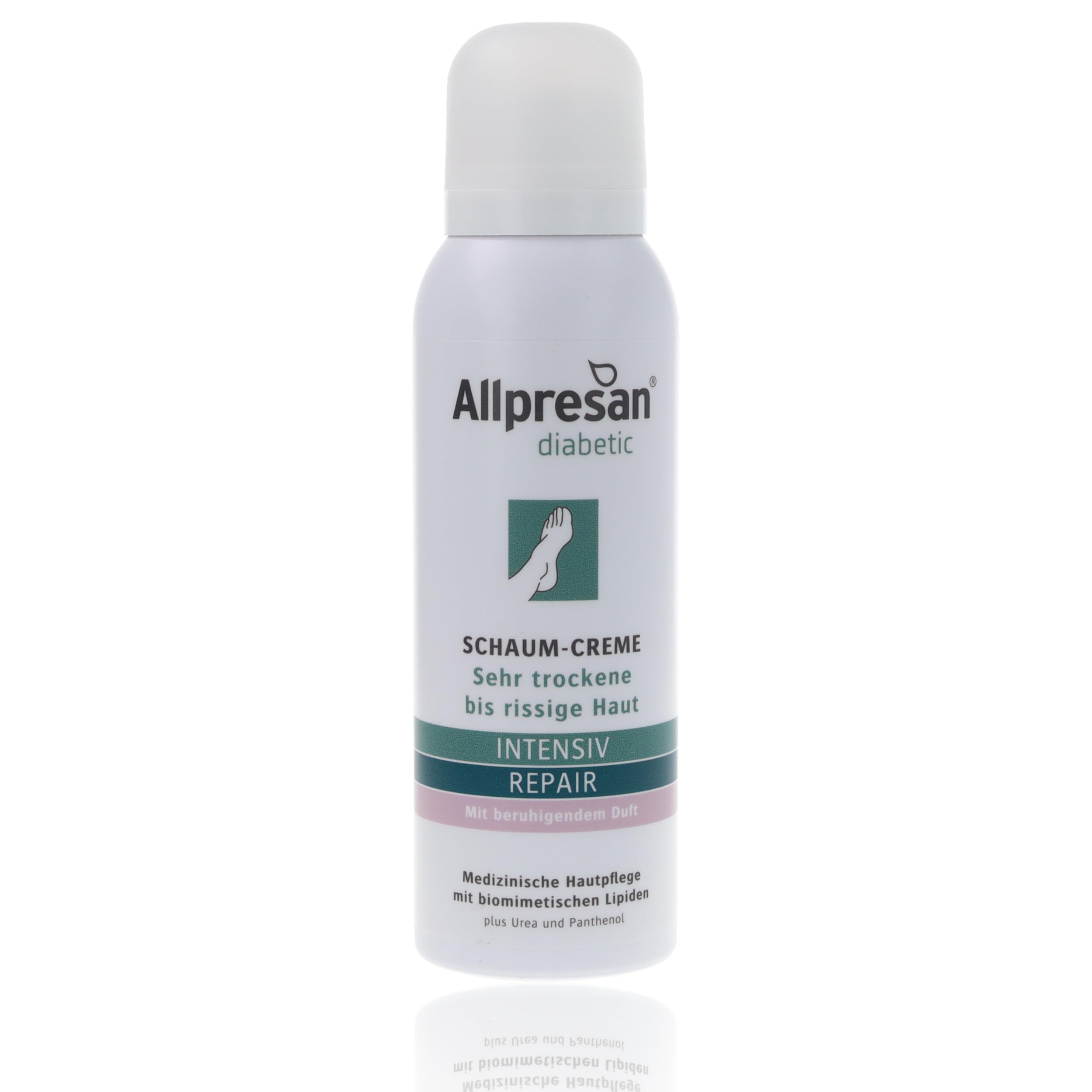 : The skin on the feet of people with diabetes is often extremely dry due to various factors related to the disease. The skin barrier lacks important lipids that prevent further moisture loss. Allpresan Diabetic Intensive Repair Foaming Cream with Urea combines the intensive hydration of Allpresan Diabetic Intensive with the repairing effect of biomimetic lipids. It is proven that the damaged skin barrier is repaired in just 4 weeks. Result: restores the skin barrier's natural protective function. In addition, skin regeneration is promoted, contributing to a lasting improvement in the skin's condition. Soothing fragrance. Directions for Use: Ideally, Allpresan Diabetic Intensive Repair Foaming Cream with Urea should be applied twice a day (morning and evening) or as needed to very dry and chapped areas of the skin to optimally care for diabetic skin. Thanks to BarrioExpert LIPO² skin repair technology with biomimetic lipids plus pentavitin, the foaming cream is particularly economical – a small amount is already sufficient for large areas of skin.