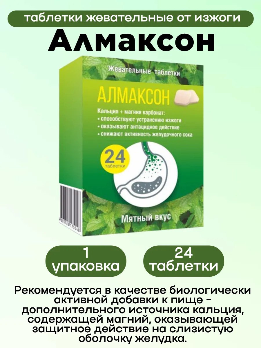 Almaxon mint-flavored tablets are a dietary supplement containing calcium carbonate and magnesium carbonate. They neutralize hydrochloric acid and reduce stomach discomfort. This product is recommended as a supplemental source of calcium and also protects the gastric mucosa. Each tablet contains 250 mg of calcium and 20 mg of magnesium. Adults are recommended to chew or hold in the mouth until completely dissolved: 1 tablet twice daily or 2 tablets once daily. Duration of treatment is 1 month. If necessary, treatment can be repeated.