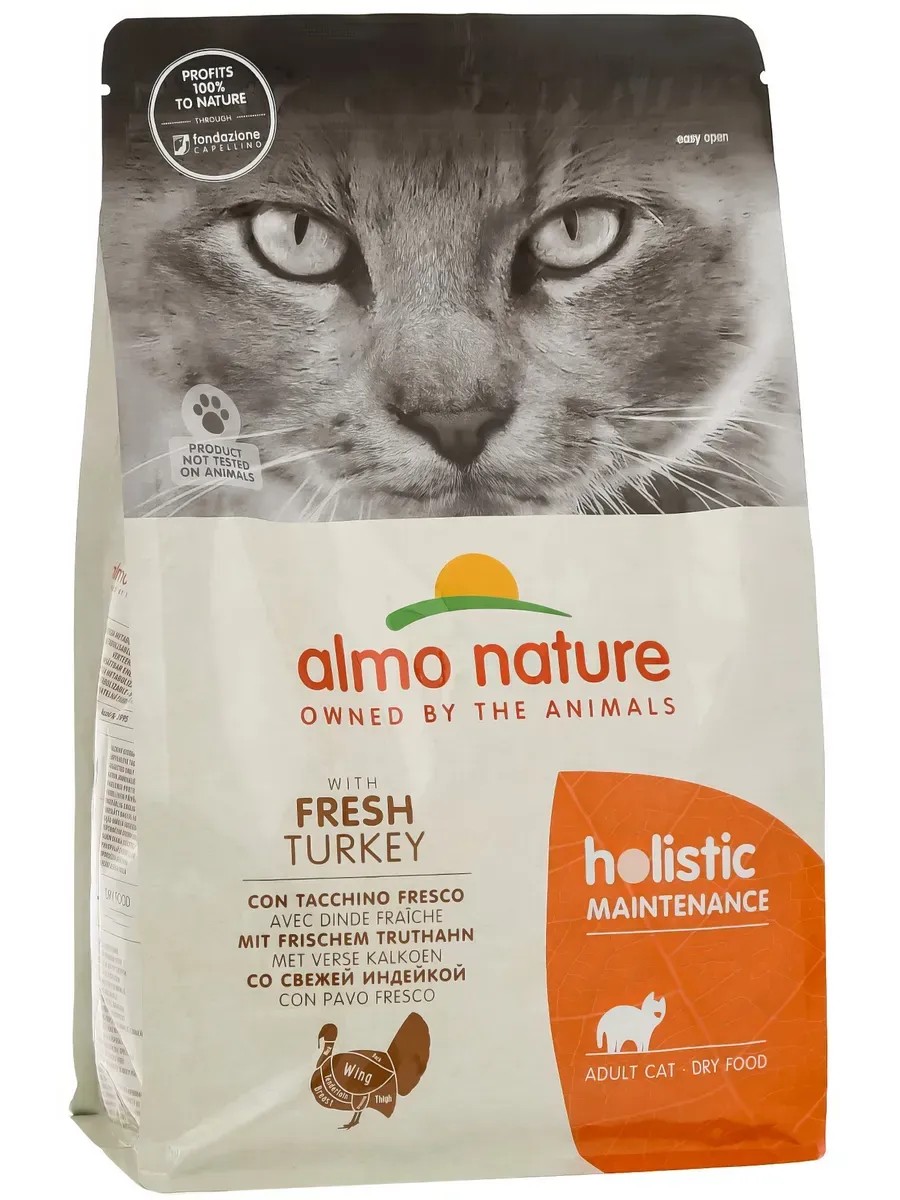Корм Almo Nature HolisticMaintenance Fresh Turkey для кошек, для поддержания здоровья, со свежей индейкой, 2 кг. Корм Almo Nature Holistic Maintenance Fresh Turkey для кошек, для поддержания здоровья, со свежей индейкой, 2 кг Almo Nature - бренд, который верит, что домашние животные заслуживают самого лучшего. Мы нашли идеальное сочетание природы и технологий, взяв натуральные качественные ингредиенты и объединив их с наукой о питании и современными стандартами качества. Almo Nature использует только натуральные ингредиенты, без искусственных красителей, ароматизаторов и консервантов. Корм Almo Nature Для взрослых кошек с индейкой - это идеально сбалансированная формула, созданная для обеспечения всех естественных потребностей взрослой кошки и поддержания ее крепкого здоровья. В составе корма 44% индейки, включая свежую и дегидрированную, что делает его не только вкусным, но и богатым легкоусвояемым животным белком, необходимым для поддержания мышечной массы и активного образа жизни. Оптимальное соотношение белков и клетчатки в составе корма способствует правильной работе кишечника и помогает поддерживать здоровую массу тела без риска ожирения. Корм Almo Nature Для взрослых кошек с индейкой производится в Италии и России и соответствует всем европейским стандартам качества. Мясные ингредиенты, входящие в состав, соответствуют стандарту Human Grade, то есть имеют такое же высокое качество, как и продукты, предназначенные для людей. Страна производства: Италия-Россия. Рекомендации по кормлению: Суточная норма может варьироваться в зависимости от возраста, комплекции и уровня активности вашего питомца. Не забывайте своевременно пополнять миску свежей питьевой водой. Ингредиенты: индейка 44% (свежая индейка 26%, дегидрированная индейка 18%), маис*, рис, мука из коричневого риса, гидролизованные животные белки, куриный жир, дегидрированная говядина 1,3%, минералы, маннанолигосахариды 0,1%, инулин из цикория - источник ФОС - 0,1%