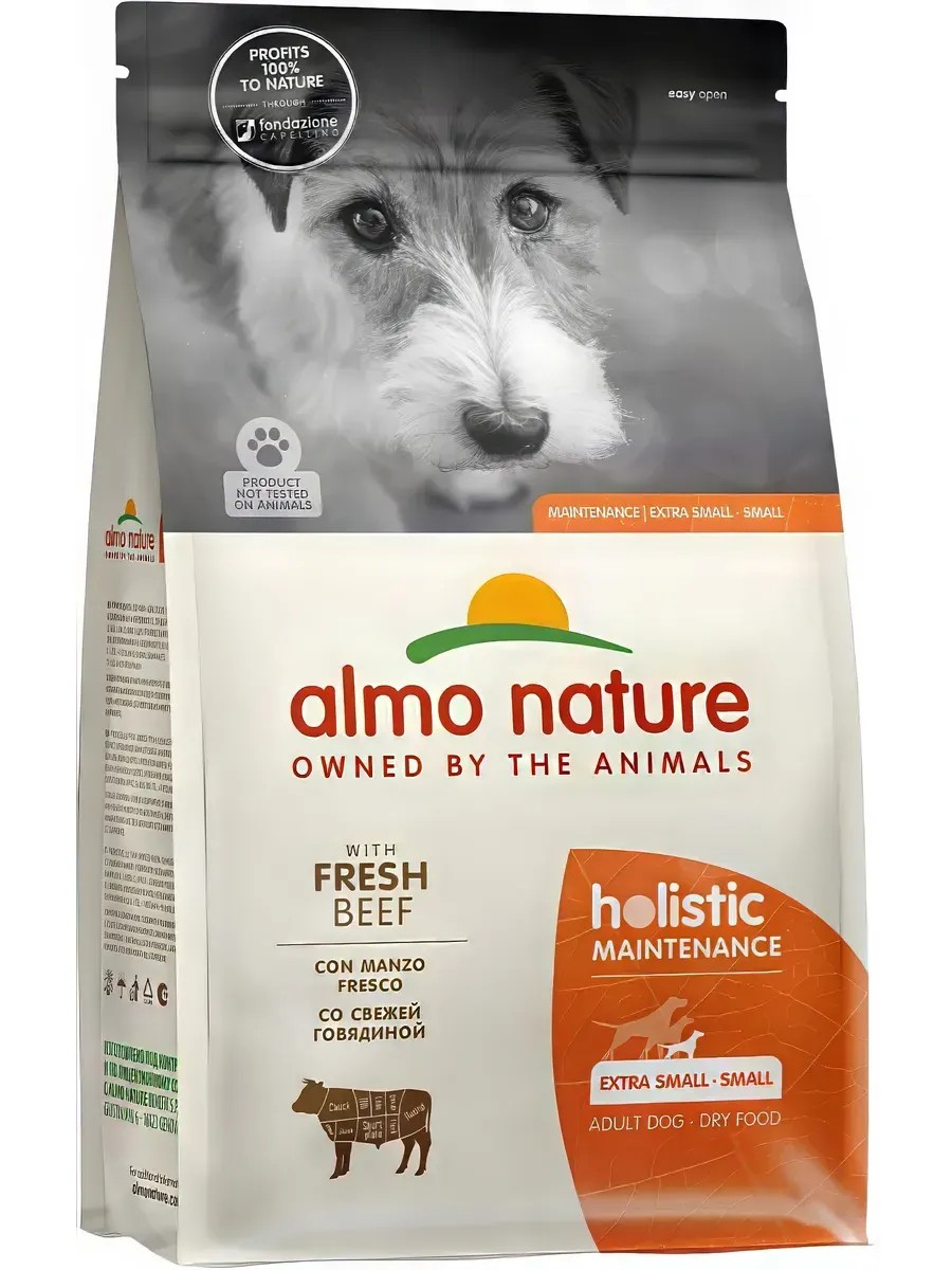 Almo Nature Holistic Maintenance Small & Extra Small Fresh Beef for small and miniature breed dogs, with beef, 12 kg. Almo Nature is a brand that believes pets deserve the best. We have found the perfect combination of nature and technology, taking natural, high-quality ingredients and combining them with nutritional science and modern quality standards. Almo Nature uses only natural ingredients, without artificial colors, flavors, or preservatives. Almo Nature Adult Small Breed Dog Food with Beef is specially formulated for small but active pets to provide them with everything they need for good health and energy. It contains 29.2% beef, including fresh and dehydrated, providing a high content of easily digestible protein necessary for maintaining muscle mass and an active lifestyle. Mannan oligosaccharides and inulin from chicory, which are prebiotics, promote healthy digestion and strengthen the dog's immune system. The optimal kibble size is convenient for small-breed dogs, and the balanced amount of proteins, fats, and carbohydrates helps maintain activity without the risk of excess weight gain. Almo Nature food is produced in Italy and Russia and meets all European quality standards. The meat ingredients included in the composition meet the Human Grade standard, that is, they are of the same high quality as products intended for people. Country of origin: Italy-Russia. Ingredients: beef 29.2% (fresh beef 25%, dehydrated beef 4.2%), brown rice, corn, dehydrated chicken meat 12.5%, chicken fat, hydrolyzed animal proteins, beet pulp, yeast, fish oil, minerals, mannanoligosaccharides 0.1%, chicory inulin - a source of FOS - 0.1%, yucca schidigera 0.01%