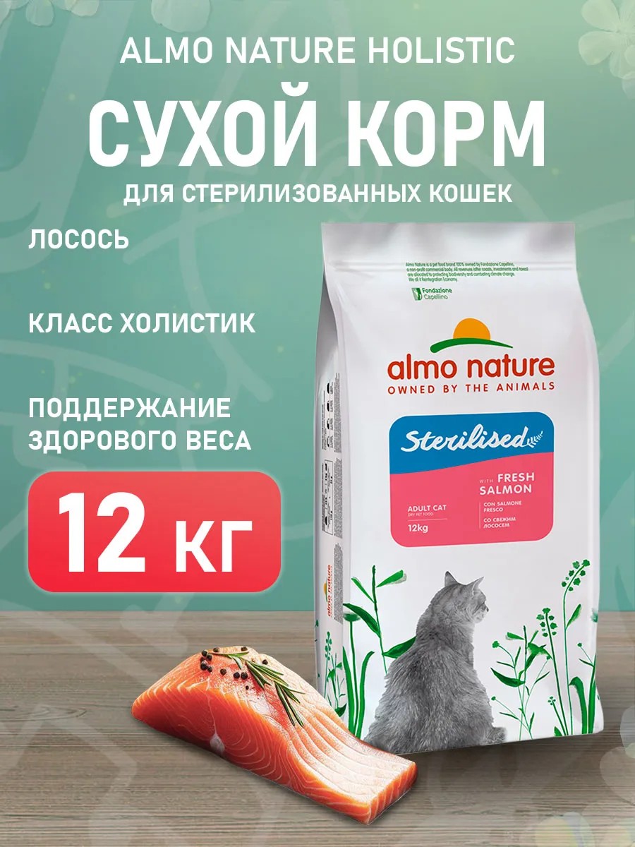 ALMO NATURE Корм сухой Holistic для стерилизованных кошек лосось 12кг