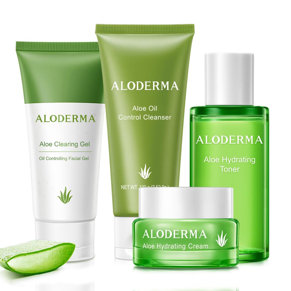 Aloderma Aloe Oil Controlling Set, 4 pcs - Aloe Clearing Gel, Oil Controlling Cleanser, Hydrating Cream, Hydrating Toner