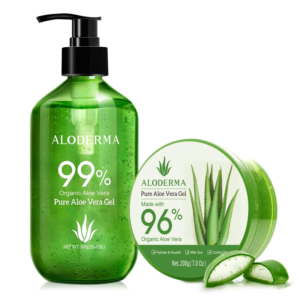Aloderma: We are a family run farm-to-face skin care line focused on producing and creating high-quality organic aloe vera-based products in an ecologically friendly way. We grow organic aloe vera on our own farms and manufacture all of our products in our factory, which are certified USDA and European Union organic by ECOCERT. Aloderma has over 20 years of working with Aloe providing high quality and affordable products for beauty, health and wellness. Made Within 12 Hours of Harvest: At Aloderma, our skincare is rooted in the earth. Our Aloe is processed on-site and turned into final products within hours of leaving the fields to ensure that we capture the natural power of Aloe Vera in every product we make. 200g Aloe Vera Gel: Aloderma Pure Aloe Gel is a fast-acting moisturizer that helps restore skin's natural balance and hydration. It provides intense hydration for a plump and supple complexion. It's lightweight and fast-absorbing and it's suitable for all skin types. 300 Aloe Vera Gel: Boost your skin's hydration and soothe dryness with our organic aloe vera gel. Our pure aloe gel for sunburn relief is a gentle, cooling gel that helps to soothe the skin and provide relief from dry, sensitive and irritated skin. Shield your skin with our aloe vera gel, a natural barrier against harmful environmental elements.