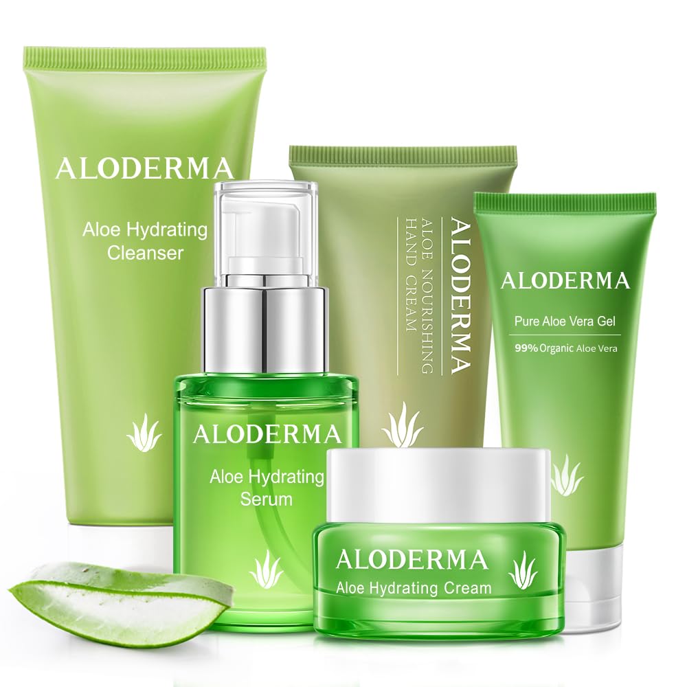 Aloderma Travel Size Hydrating Set - 5 Pieces - Gel Cream Serum Cleanser Hand Cream