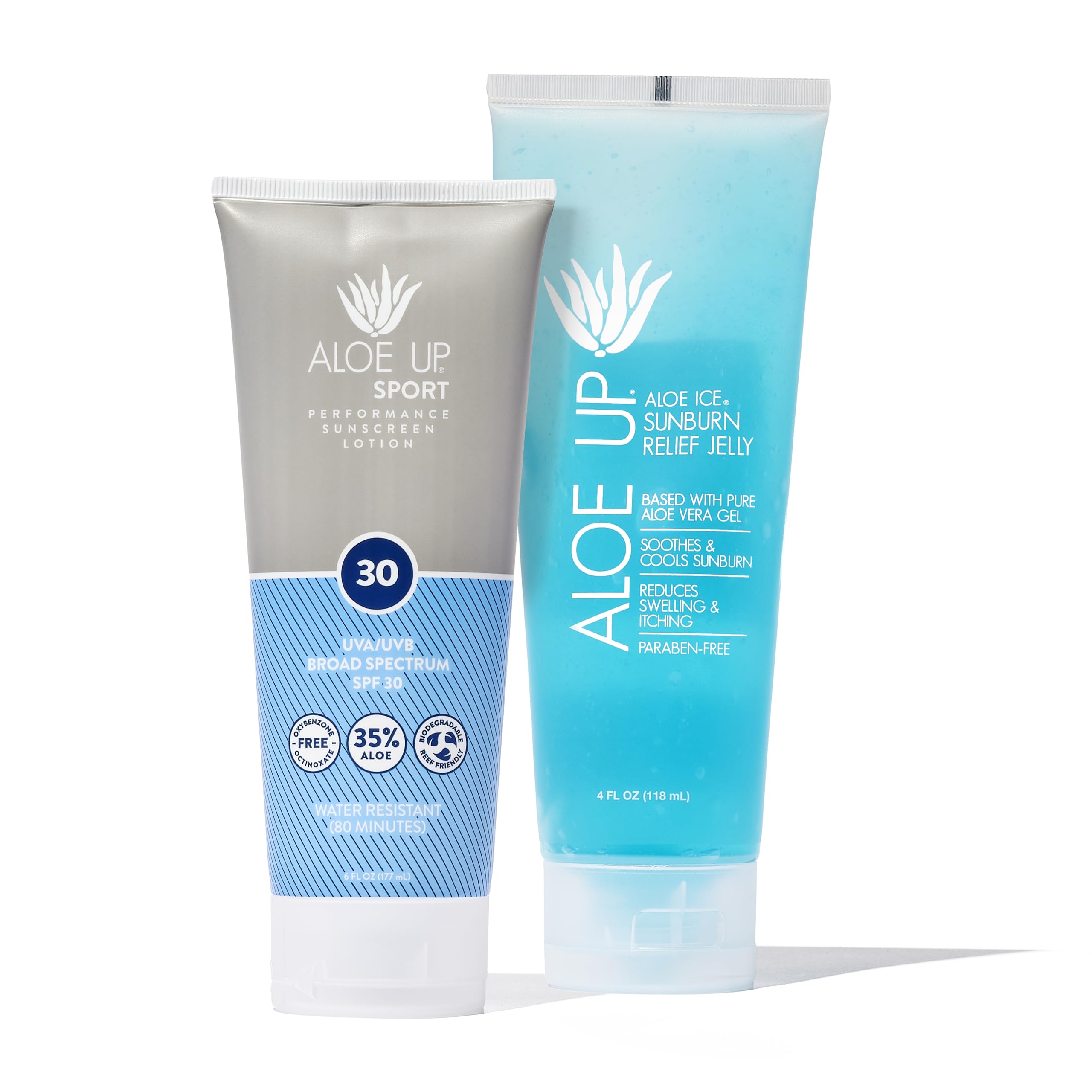 ALOE UP: For four decades, Aloe Up has defined the field of luxury sun and skin care. We base all of our products with pure aloe vera gel. We pride ourselves in creating the most comfortable, clean, and effective skincare safe for people and the environment. GOOD FOR YOU AND THE EARTH: Aloe Up's Aloe Ice and SPF 30 Sport Sunscreen Lotion both have formulas free of fragrance, alcohol, oxybenzone, octinoxate, and parabens. Cruelty-free, our reef-friendly suncare is good for you and the environment. ABSORBS QUICKLY: Our aloe-based formulas absorb fast, providing a non-greasy feel you won't find anywhere else. Aloe stimulates your immune system, promoting natural skin cell regeneration, making it an excellent burn relief product. With Aloe Up sunscreens, aloe vera carries the sunscreen into your pores, ensuring comfortable and sheer wear by bonding beneath the skin's surface. NATURAL CUTTING-EDGE INGREDIENTS: Aloe Up's products start with a foundation of pure aloe vera gel. Our Sport Sunscreen lotion goes on light, leaving no greasy residue on gear, and won't run into your eyes and sting. Aloe Ice cooling jelly helping to reduce swelling and itching. THE GO-TO SUNCARE SET: Protect yourself from the sun and stay moisturized after sun exposure with Aloe Up's suncare essentials. This bundle includes two items: the Sport Sunscreen Lotion SPF 30 for full UVA UVB broad spectrum protection and Aloe Ice Sunburn Relief Jelly for after sun care.
