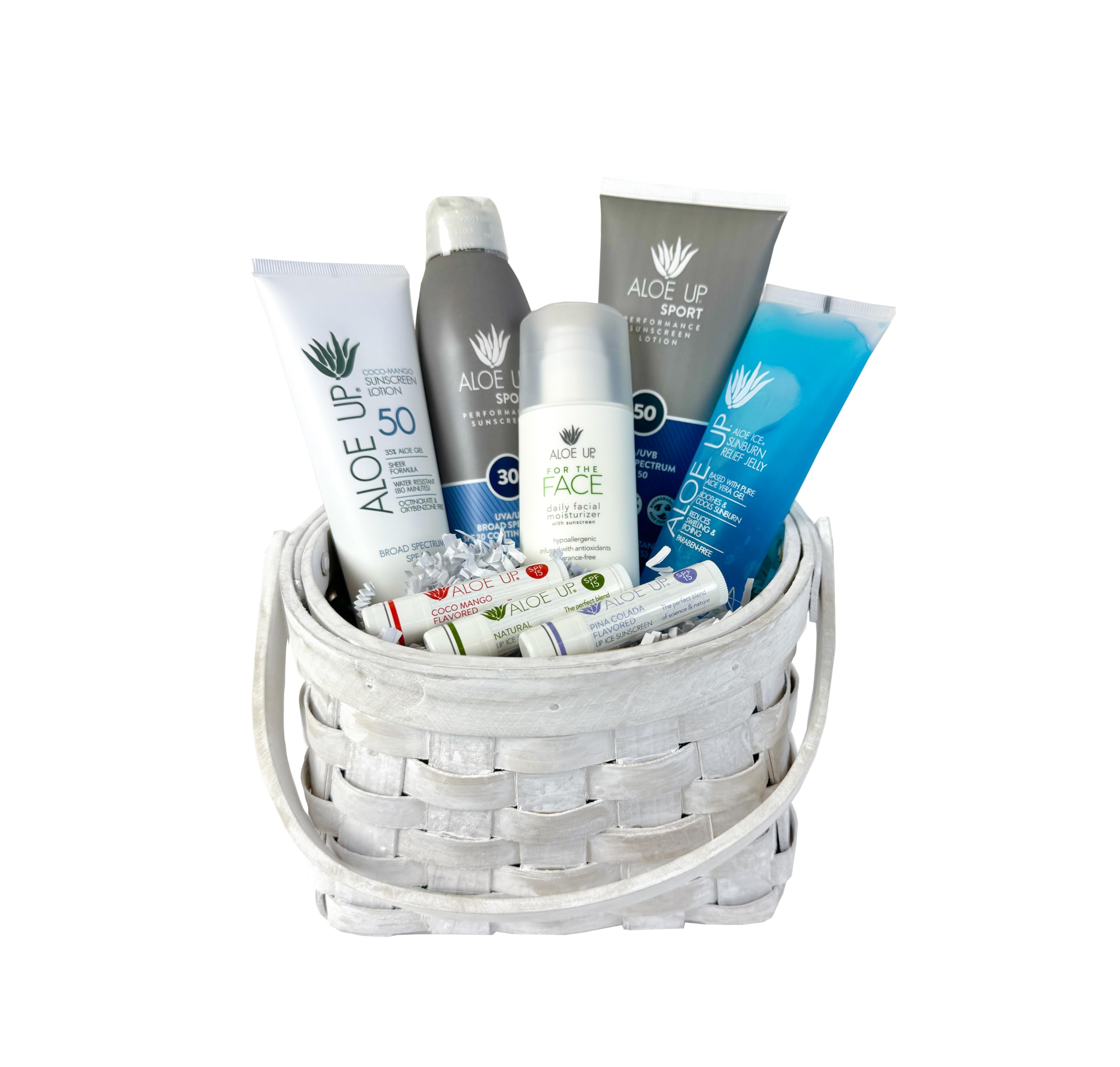 Aloe Up Sun & Skin Care Gift Basket 6-Piece for Men & Women Set with SPF Moisturizers Sport Sunscreens Lip Balm & Aloe Gel Alcohol-Free Reef Friendly Hydrating Skincare Kit