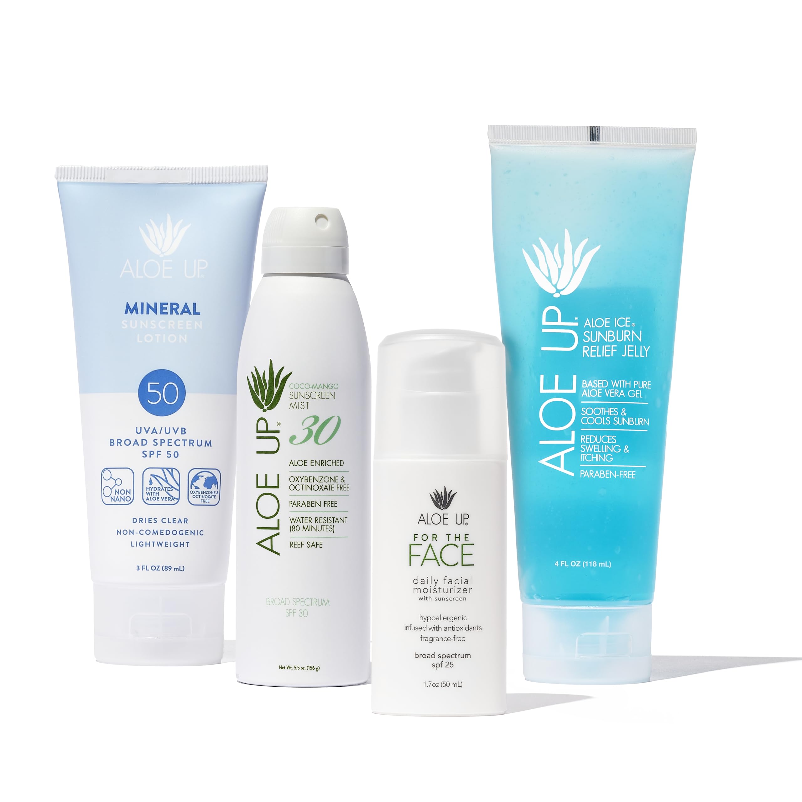 Aloe Up suncare works better, feels better, and lasts longer because of aloe vera gel. This bundle includes four essentials: the 3 oz. Mineral Sunscreen Lotion SPF 50, the 6 fl. oz. White Collection Sunscreen Spray SPF 30, the 4 oz. Aloe Ice Sunburn Relief Jelly, and the 1.7 oz. SPF 25 For the Face Daily Moisturizer for all skin types. Apply Aloe Ice to burns, cuts, scrapes, bug bites, and jellyfish stings to relieve pain. In our sunscreens, aloe vera carries the sunscreen into your pores so it doesn't sit on top of your skin and feel greasy or wash off easily. Our products use the natural moisturizing properties of aloe vera to create fast-absorbing, lightweight skincare products that dry quickly and evenly. Feel the difference in your skin with Aloe Up skincare.ALOE UP: For four decades, Aloe Up has defined the field of luxury sun and skin care. We base all of our products with pure aloe vera gel. We pride ourselves in creating the most comfortable, clean, and effective skincare safe for people and the environment. GOOD FOR YOU AND THE EARTH: Aloe Up's Aloe Ice, SPF 25 For the Face Daily Moisturizer Sunscreen, Mineral Sunscreen Lotion SPF 50, and White Collection Sunscreen Spray SPF 30 all have formulas free of oxybenzone, octinoxate, and parabens. Our reef-friendly suncare is good for you and the environment. ABSORBS QUICKLY: Our aloe-based formulas absorb fast, providing a non-greasy feel you won't find anywhere else. Aloe stimulates your immune system, promoting natural skin cell regeneration, making it an excellent burn relief product. With Aloe Up sunscreens, aloe vera carries the sunscreen into your pores, ensuring comfortable and sheer wear by bonding beneath the skin's surface. NATURAL CUTTING-EDGE INGREDIENTS: Aloe Up's products start with a foundation of pure aloe vera gel. Our sunscreen formulas go on light and won't sting your eyes. The Aloe Ice cooling jelly quickly relieves pain while our Gen2 zinc oxide mineral sunscreen leaves behind no white cast. ELEVATE YOUR SUNCARE: This bundle includes four items: the Mineral Sunscreen Lotion SPF 50, White Collection Sunscreen Spray SPF 30, and For the Face Daily Moisturizer with SPF 25 Sunscreen, all delivering full UVA UVB protection, alongside the soothing Aloe Ice Sunburn Relief Jelly, designed to enhance after sun care.