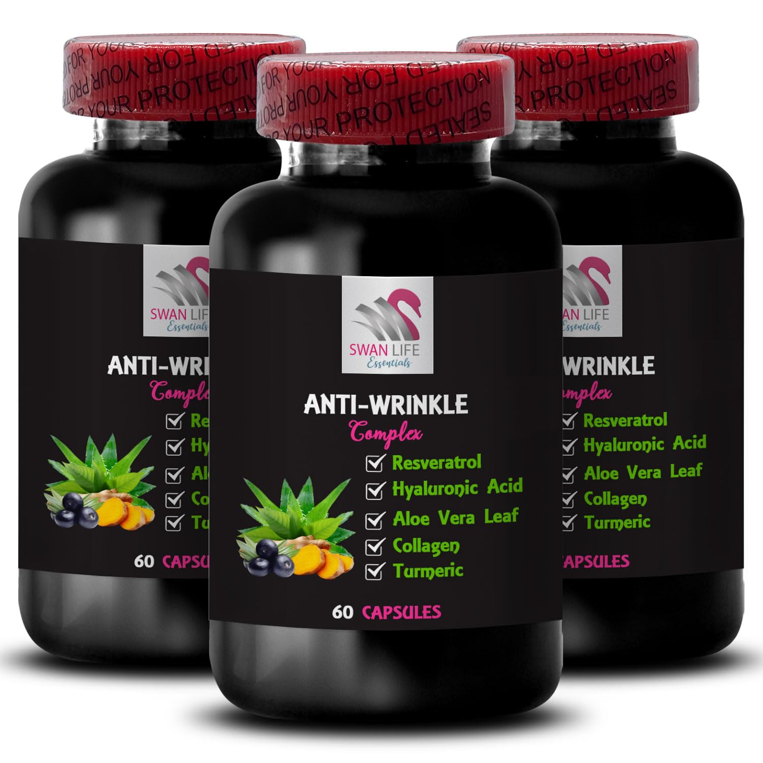 Aloe Vera - ANTI-WRINKLE COMPLEX - Alpha Lipoic Acid, Collagen Boost, Grape Seed, Lycopene, Green Coffee Bean, Turmeric, L-Glutathione, Hydration Power, Firming Texture, Skin Care 3 Bottles 180 CapsulesANTI-WRINKLE COMPLEX: Our Premium anti-wrinkle complex is made with the high-quality ingredients, Vegan, Non-Gmo, Gluten-free. This solution is safe and effective for wellness. Manufactured in an NSF certified and GMP compliant facility, SWAN LIFE ESSENTIALS ensures strict adherence to quality standards throughout the production process. ANTI-WRINKLE COMPLEX WITH GREEN TEA LEAF: Green tea is a powerhouse of antioxidants, particularly catechins, which are known for their anti-aging benefits. The high levels of polyphenols in green tea help protect the skin from and environmental stressors, which can accelerate the aging process. Additionally, green tea has properties that can reduce redness and puffiness, leading to a more even complexion. ANTI-WRINKLE COMPLEX WITH COLLAGEN: Collagen is the most abundant protein in the human body, playing a crucial role in maintaining skin structure, elasticity, and hydration. As we age, collagen production naturally getting lower, leading to sagging skin and the formation of wrinkles. Incorporating collagen into skincare formulations helps replenish this protein, promoting a firmer and plumper appearance. ANTI-WRINKLE COMPLEX WITH ALOE VERA LEAF: Aloe Vera is known for its soothing and moisturizing properties, making it a staple in skincare. Rich in vitamins, minerals, and amino acids, Aloe Vera leaf extract hydrates the skin while providing nutrients that promote rejuvenation. Its properties help to calm irritated skin, reducing redness and puffiness. ANTI-WRINKLE COMPLEX WITH RESVERATROL: Resveratrol is a powerful antioxidant primarily found in the skin of red grapes, berries, and certain plants. It has gained significant attention for its anti-aging properties, particularly in skincare. Resveratrol helps to reduce oxidative stress, which is a major contributor to skin aging. ANTI-WRINKLE COMPLEX: Our powerful dietary supplement designed to support a balanced internal environment and promote optimal well-being. This advanced formula combines the natural benefits of Resveratrol, Alpha Lipoic Acid, Aloe Vera Leaf, Collagen, Green Tea Leaf, Grape Seed, Green Coffee Bean, Hyaluronic Acid, Glycine, L-Glutathione, Turmeric and Lycopene with a blend of potent ingredients known for their properties.