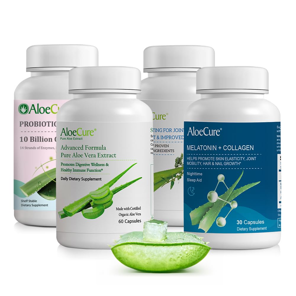 Made Within 12 hrs of Harvest: AloeCure maintains the maximum natural bioactivity found in Aloe Vera by using only the inner leaf of Gel and a proprietary low temperature process free of chemicals, charcoal filtration, or enzymes to remove aloin. We never use whole leaf aloe or fractionally distill our aloe. Our Aloe is processed on-site and turned into final products within 12 hours of leaving the fields to ensure that we capture the natural power of Aloe Vera in every product we make. VeraFlex: Experience natural joint support with our trusted formula, backed by clinically proven ingredients, as reported by trial participants in as little as 3 days. VeraFlex is a natural plant-based joint supplement for men women designed to support joint comfort, flexibility, and mobility for active individuals. Melatonin: AloeCure natural sleep supplement with melatonin is a great solution for restful nights recharged days. Experience the sweet comfort of a good night's sleep with our organic aloe vera infused sleep aid. Wake up feeling refreshed, rejuvenated, and ready to conquer the day!. Probiotics Enzymes: Strengthen and support your gut with our natural formula with super digestive enzymes, probiotics and prebiotics for women's digestive health. Our poten formula balances stomach acid production for improved digestive comfort. Aloe Capsules: Soothe your stomach and promote healthy digestion with our organic aloe vera supplement, specially formulated to buffer stomach acid, support pH regulation and enhance digestive health for optimal well-being.