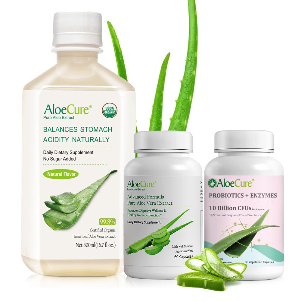 AloeCure: We are family owned and operated Aloe Vera producer. We never outsource Aloe, our primary ingredient, and always process our products on-site in our owned and operated facilities to produce the highest quality organic aloe vera-based products in an ecologically friendly way. Our farms and factory are certified USDA and European Union organic by ECOCERT. AloeCure has over 20 years of working with Aloe providing high quality and affordable products for beauty, health and wellness. Naturally Processed: AloeCure maintains the maximum natural bioactivity found in Aloe Vera by using only the inner leaf of Gel and a proprietary low temperature process free of chemicals, charcoal filtration, or enzymes to remove aloin. We never use whole leaf aloe or fractionally distill our aloe. Our Aloe is processed on-site and turned into final products within 12 hours of leaving the fields to ensure that we capture the natural power of Aloe Vera in every product we make. Probiotics Enzymes: Strengthen and support your gut with our natural formula with super digestive enzymes, probiotics and prebiotics for women's digestive health. Our poten formula balances stomach acid production for improved digestive comfort. Aloe Capsules: Soothe your stomach and promote healthy digestion with our organic aloe vera supplement, specially formulated to buffer stomach acid, support pH regulation and enhance digestive health for optimal well-being. Aloe Vera Juice: Our Aloe Vera Juice restores balance to your entire being. It soothes and calms your digestive system and aids you to experience better digestion and nutrient absorption. It offers a potent and chemical-free formula to promote balanced stomach acidity and overall digestive wellness. It is Naturally Gluten Free, GMO Free, Vegan, Keto Paleo Friendly.