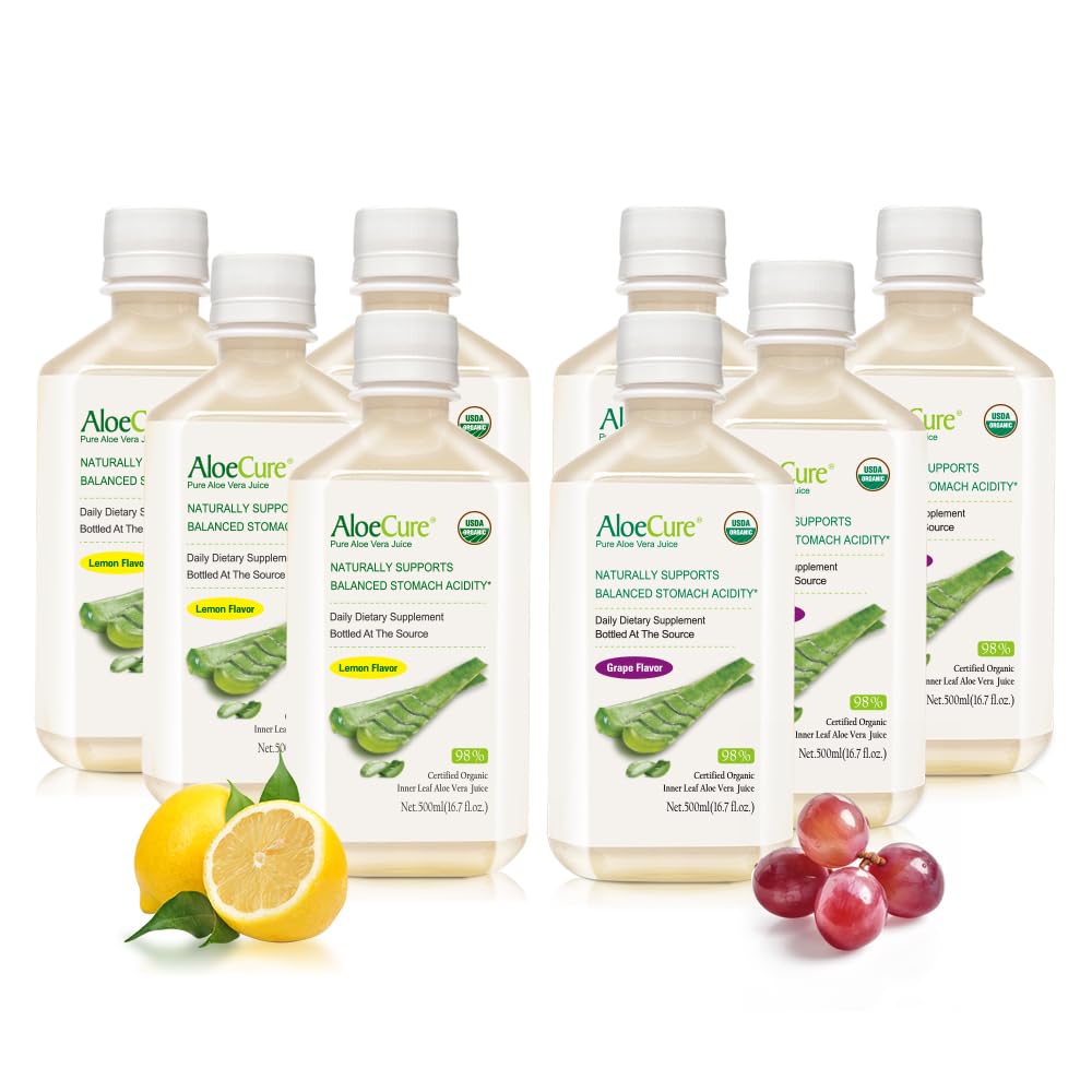 AloeCure Organic Aloe Vera Juice - 8 Bottle Sample Pack - Grape and Lemon Flavor 8x500ml