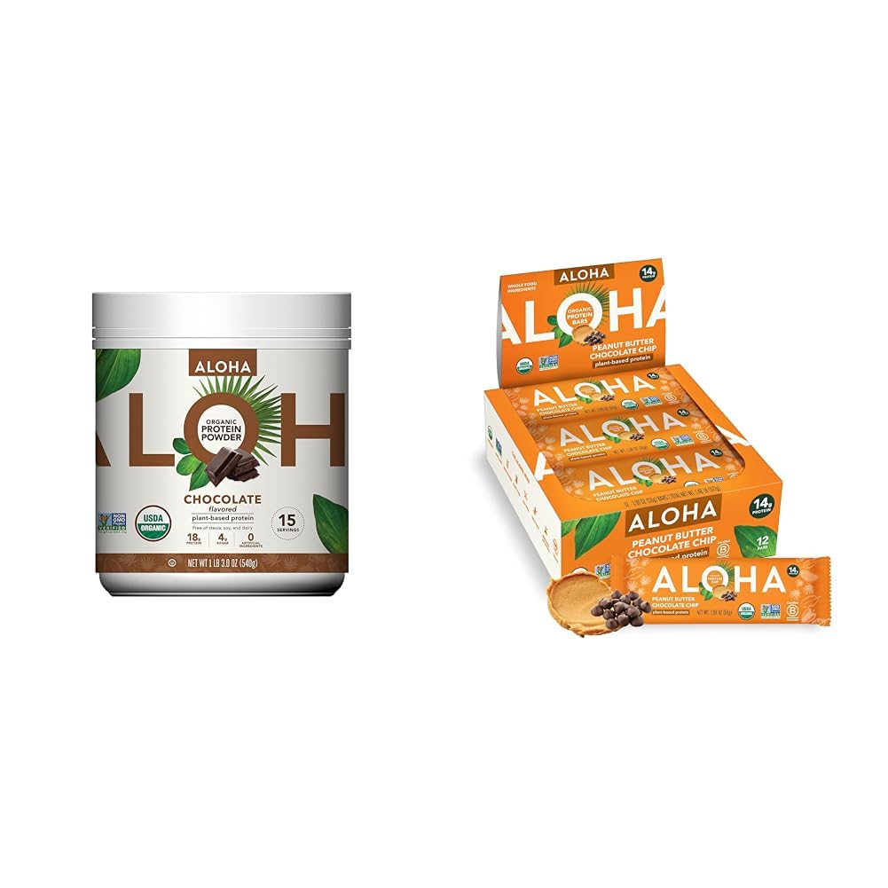 This bundle includes ALOHA's organic chocolate protein powder (1.1lb) and peanut butter chocolate chip protein bars (pack of 12). The protein powder provides a great-tasting way to get 18g of plant-based protein per serving from pea, brown rice, pumpkin seed and hemp. With only 3g sugar and 5g fiber, it can be blended into smoothies or shakes for a protein boost anytime. The bars deliver 14g protein with 13g fiber and just 4g sugar, using organic brown rice and pumpkin seed protein. Together, these complementary products offer delicious, organic, non-GMO, gluten-free, soy-free, dairy-free, high-protein snacks and meal replacements. The powder is versatile for blending while the bars are convenient for on-the-go. Both provide clean, plant-based protein from high-quality ingredients, without artificial additives or sugar alcohols. Whether you need more protein in your diet, seek paleo-friendly or vegan options, or want nutritious snacks for an active lifestyle, this bundle has organic and great-tasting solutions covered.