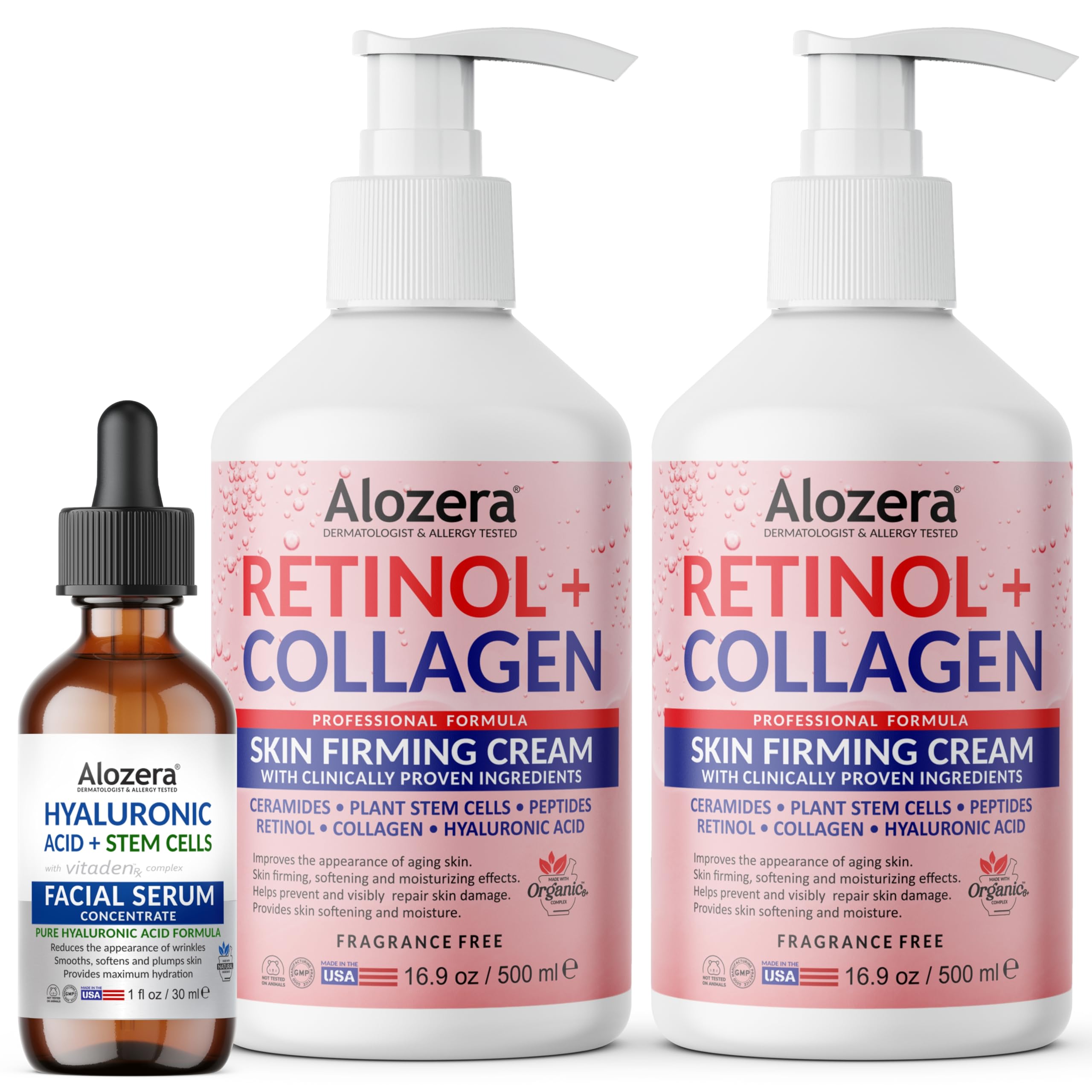 Achieve visibly smoother, firmer, and deeply hydrated skin with the Alozera Retinol Collagen Hyaluronic Acid Set, a complete skincare system for face, neck, and body. The Hyaluronic Acid Stem Cells Serum provides intensive moisture and rejuvenation, combining Pure Hyaluronic Acid, Marine Collagen, Ceramides, and Aloe Vera to restore suppleness and glow. Its lightweight texture absorbs instantly, layering perfectly under moisturizer for round-the-clock hydration. The Retinol Collagen Firming Lotions complement the serum with an advanced blend of Retinol, Collagen, Peptides, Plant Stem Cells, and Hyaluronic Acid, helping firm and smooth the look of sagging or crepey skin while improving tone and elasticity. Together, these dermatologist-tested formulas deliver complete care, hydration, renewal, and firming, for a youthful, revitalized appearance. Clean, fragrance-free, and made in the USA, this set provides professional-level results for daily use on all skin types.Lightweight, Fragrance-Free Made in USA – Non-greasy, fast-absorbing, and gentle for all skin types. Paraben-free, sulfate-free, cruelty-free formulas crafted in USA-based labs. Plant Stem Cells Vitaden-RX Complex – Both formulas use plant-derived actives and rejuvenating complexes that support skin renewal and healthy barrier function. Pure Hyaluronic Acid Serum – Deeply hydrating formula with Hyaluronic Acid, Stem Cells, and Ceramides delivers 1000x moisture retention for plumper, softer, refreshed skin. Retinol Collagen Firming Cream – Advanced body lotion helps firm, tighten, and smooth crepey or aging skin while improving tone, elasticity, and hydration. Hydration Firming Power Duo – Complete skincare set with (1) Hyaluronic Acid Stem Cells Facial Serum and (2) Retinol Collagen Firming Body Lotions for head-to-toe hydration and renewal.