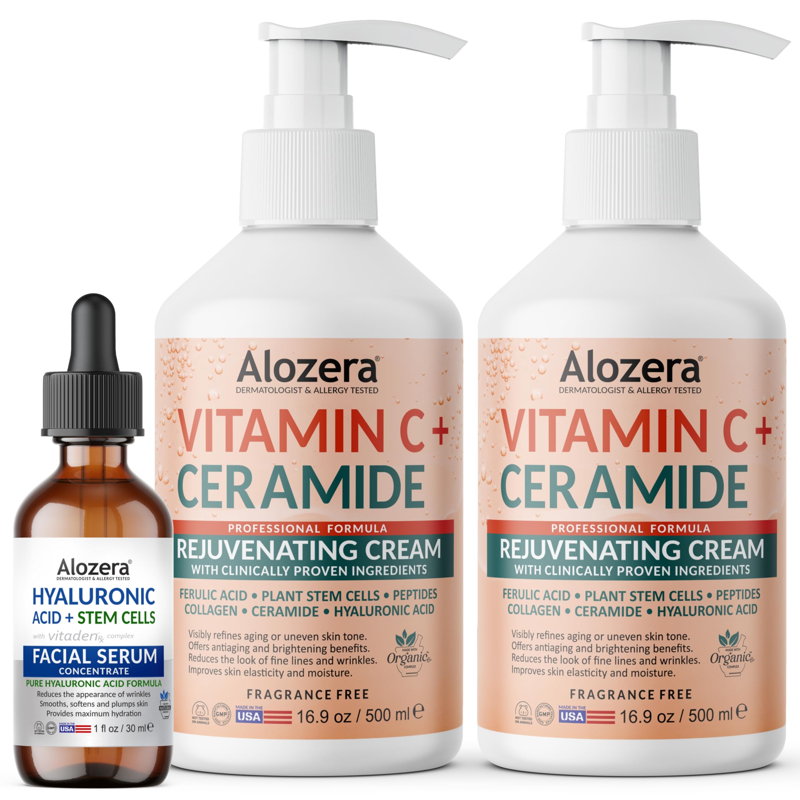 Replenish and renew your skin with the Alozera Vitamin C Lotion and Hyaluronic Serum Set, a complete hydration and barrier-care routine for face and body. The Vitamin C Ceramide Body Lotions (2-Pack) deliver lasting moisture with Vitamin C, Ferulic Acid, Ceramides, Peptides, and Plant Stem Cells, helping nourish and soften dry skin while supporting a resilient, healthy-looking barrier. The Hyaluronic Acid Stem Cells Serum enhances hydration with Pure Hyaluronic Acid, Marine Collagen, Ceramides, and Aloe Vera, helping restore moisture balance and promote a plump, supple feel. Together, they form a lightweight, non-greasy routine that hydrates, smooths and revitalizes the skin without irritation. Both formulas are fragrance-free, dermatologist-tested, and made in the USA with clean, plant-based ingredients for everyday use.Clean and USA Made – Dermatologist-tested and cruelty-free crafted with plant-powered ingredients and free from parabens, sulfates and synthetic fragrance. Lightweight and Non-Greasy – Fast-absorbing, fragrance-free textures ideal for dry, mature or sensitive skin suitable for morning and night use. Pure Hyaluronic Acid Serum – Concentrated hydration blend with Marine Collagen, Ceramides and Aloe Vera helps replenish moisture and maintain a plump, refreshed appearance. Vitamin C Ceramide Lotion – Formulated with Vitamin C, Ferulic Acid, Hyaluronic Acid, Peptides and Plant Stem Cells to nourish and support skin's natural barrier for a soft, comfortable feel. Hydrate and Rejuvenate System – Two Vitamin C Ceramide Body Lotions and one Hyaluronic Acid Serum work together to deliver deep moisture and improve the look of smoothness and elasticity.