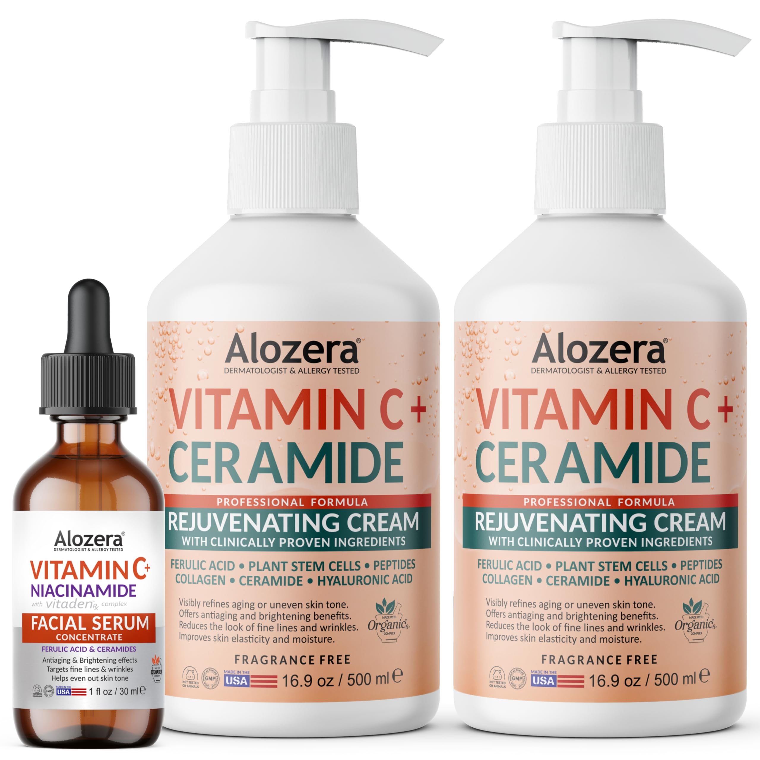 Hydrate and refresh your skin with the Alozera Vitamin C Lotion and Serum Set, a complete routine that supports moisture balance and visible radiance. The Vitamin C Ceramide Body Lotions (2-Pack) deliver lightweight, long-lasting hydration with a blend of Vitamin C, Ferulic Acid, Ceramides, Collagen and Plant Stem Cells, helping nourish and fortify the skin barrier for softness and resilience. The Vitamin C Niacinamide Serum complements the lotion with antioxidant support to help visibly improve surface texture and enhance a naturally luminous appearance. Its fast-absorbing formula layers comfortably under moisturizer or sunscreen. Together, these formulas deliver a clean, dermatologist-tested solution for hydration, comfort and skin clarity, free from fragrance and harsh additives, and made in the USA with plant-powered ingredients for everyday use.