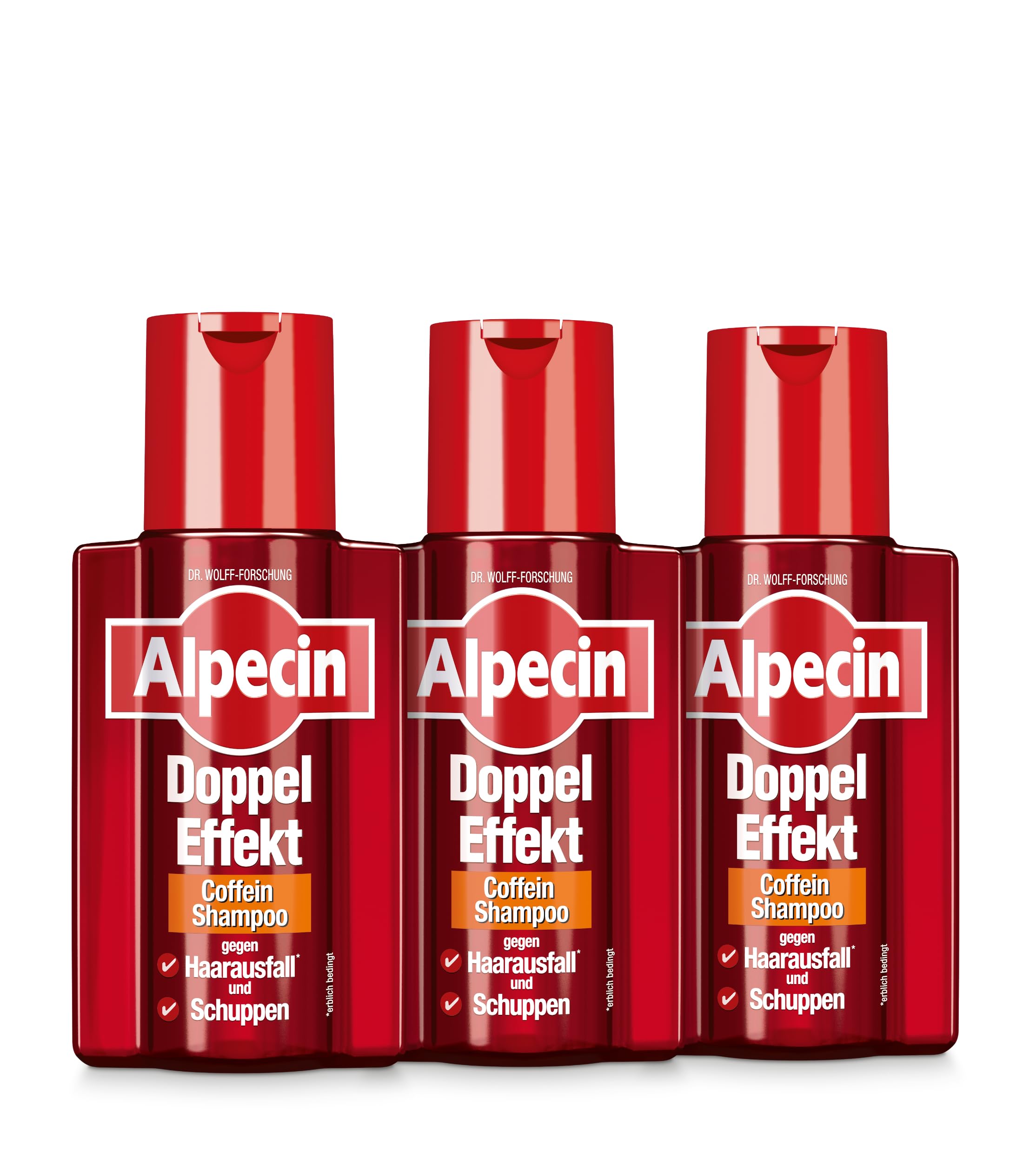 Utilisation facile : utiliser tous les jours, en massant légèrement. Laisser agir au moins deux minutes de la mousse au rinçage. 2. Effet : prévention de la chute des cheveux – Avec le cuir chevelu libéré, la voie est libre pour le complexe caféine. Le shampooing contient de la caféine hautement dosée qui pénètre dans la racine des cheveux pendant le shampooing. Il est détectable après seulement 2 minutes de temps d'exposition. Combinaison de substances actives dermatologiques : cette combinaison de substances actives a été utilisée jusqu'à présent principalement dans les produits pharmaceutiques comme solution anti-pelliculaire à base de dermatologique. Elle permet une micro-exfoliation précise et douce (micro-exfoliation) et réduit les démangeaisons du cuir chevelu. 1. Effet : efficace contre les pellicules – Avec les deux agents antipelliculaires efficaces, l'acide salicylique et la piroctone olamine, le shampooing dissout les cellules cornées incrustées et libère en profondeur le cuir chevelu des pellicules. Pourquoi double effet ? - La perte de cheveux et les pellicules : les deux problèmes de cuir chevelu les plus courants qui affectent l'homme. En tant que soin des cheveux spécialement conçu pour les hommes, la recherche du Dr Wolff a créé le Alpecin double effet caféine.