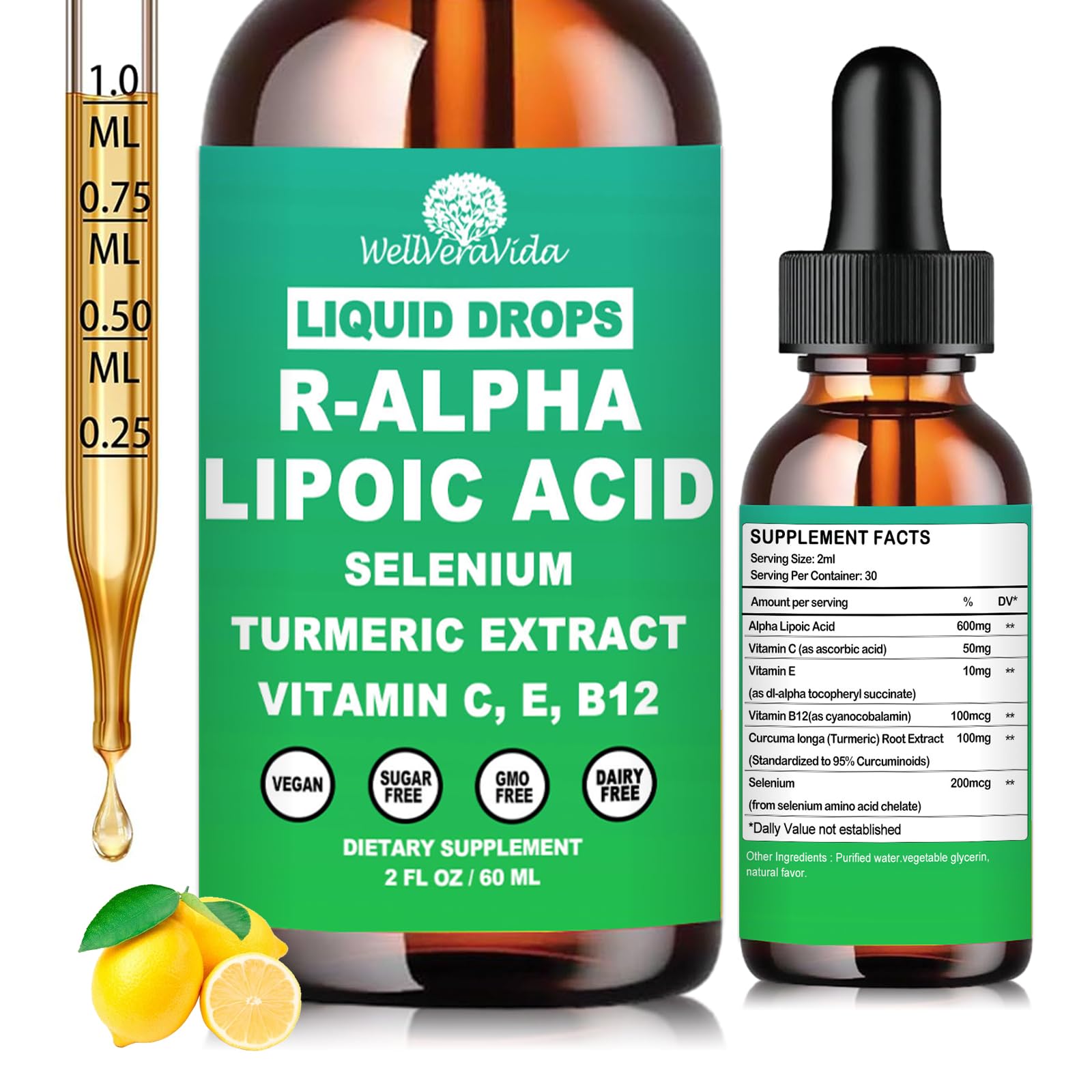 Premium Purity Quality: The pure alpha lipoic acid 600 mg is vegan, sugar free, Keto, non-GMO, gluten, dairy soy-free.The best alpha lipoic acid is ideal for women men free of artificial fillers, flavors, preservatives, and additives. Manufactured in a cGMP facility and third-party tested. We stand behind our product's safety and quality. Effective Alpha Lipoic Acid Liquid: Tired of hard-to-swallow pills? Our liquid alpha-lipoic acid blend features lemon flavor Designed to deliver a potent alpha lipoic acid 600 mg dose in just two droppers, it's an easy and delicious way to add alpha-lipoic acid (ala) to your daily routine—simply stir into tea, water, smoothies, or even drizzle over salads. This fast-absorbing ala formula is crafted for those who are busy and suitable for most lifestyles—all without the hassle of capsules or powders. . Comprehensive Wellness Support : This premium ALA complex is designed to help support overall energy, healthy metabolism, and nerve function . Formulated r-alpha lipoic acid contribute to your body's antioxidant defenses, it also aids in maintaining healthy thiamine levels, which are important for the proper function of nerves, muscles, and the heart . With ingredients that assist mental clarity, focus, and emotional balance, this alpha lipoic acid supplement provides comprehensive support for alpha brain brain and cognitive function as part of a balanced lifestyle . Advance 6-in-1 Formula: This 600mg Alpha Lipoic Acid Complex? is a synergistic formula enhanced with Turmeric, Selenium, and Vitamins B1 B12 to provide comprehensive support for nerve function, energy metabolism, and antioxidant defense. Ideal for those seeking advanced nutritional support for nervous system wellness and overall vitality. . Dual-Phase Alpha Lipoic Acid(ALA):Our alpha lipoic formula deliver a bioavailable dual-form blend of Alpha-Lipoic Acid (ALA), combining both water- and fat-soluble types. Including R ALA, the natural and more readily utilized form, and with S-ALA, to help support the body's natural ALA levels. While many standard ALA supplement provide an equal mix of both forms, our blend prioritizes inclusion of R-ALA for enhanced antioxidant activity and metabolic support in a gentle liquid .