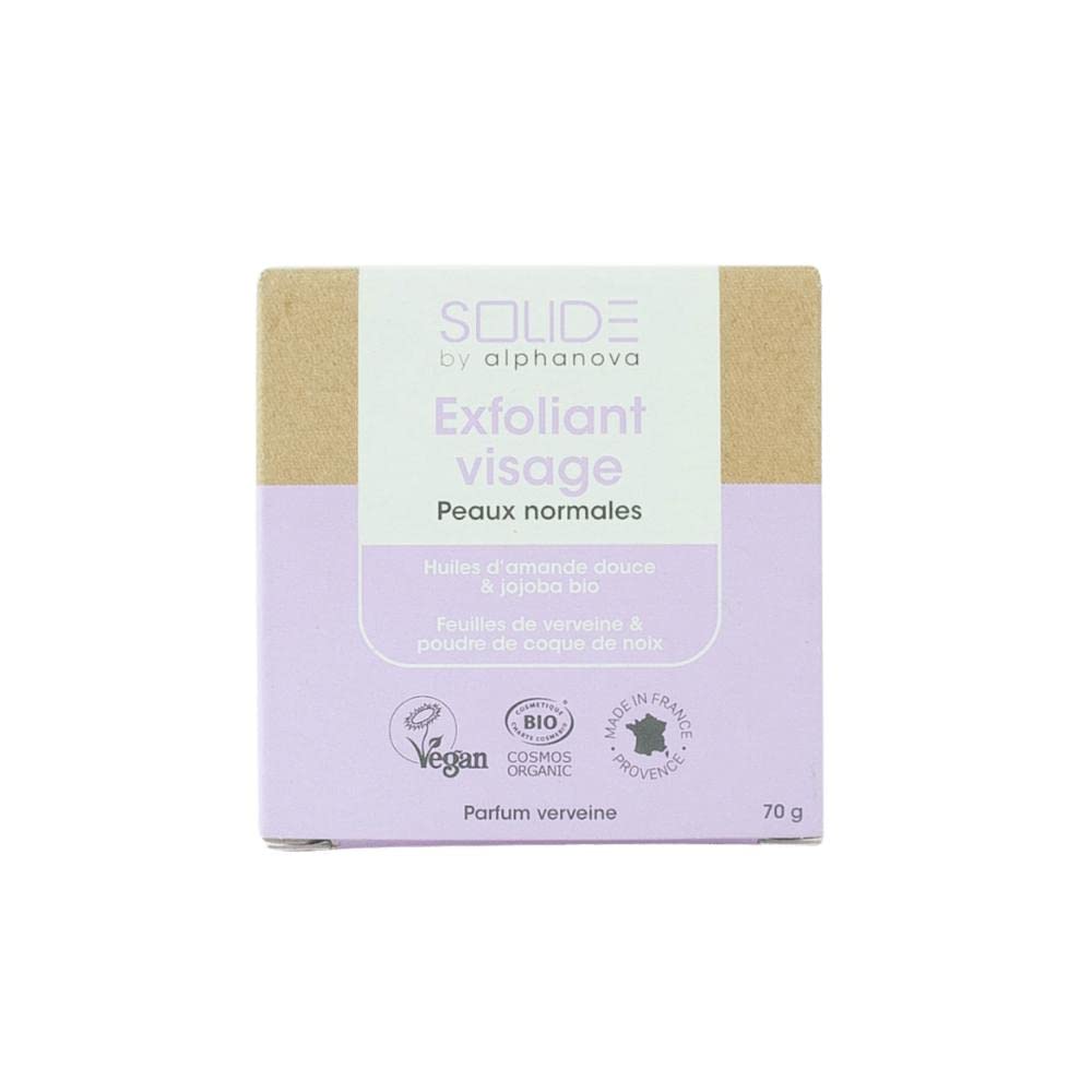 INGREDIENTS Sodium Sunflower Seed , Sodium Cocoate , Aqua (Water), Simmondsia Chinensis (Jojoba) Seed Oil , Lippia Citriodora Leaf Extract, Prunus Amygdalus Dulcis (Sweet Almond) Oil , Glycerin , Juglans Regia (Walnut) Shell Powder, Parfum (Fragrance), Propylene Glycol, Cocoyl Methylglucamide, Sorbic Acid, Sunfloweroyl Methylglucamide, Citric Acid, Sodium Chloride, Sodium Hydroxide, Tetrasodium Glutamate Diacetate. Ingredient from organic agriculture Made with organic ingredients HOW TO USE Apply all over previously damp face (for a more intense exfoliation) or lather between your hands (for a gentler cleansing). Gently massage your face, avoiding the eye area. Rinse thoroughly.Alphanova Solide - Exfoliating scrub blok - 70g INGREDIËNTEN Natrium Zonnebloemzaad , Natriumcocoate , Aqua (Water), Simmondsia Chinensis (Jojoba) Zaadolie , Lippia Citriodora Bladextract, Prunus Amygdalus Dulcis (Zoete Amandel) Olie , Glycerine , Juglans Regia (Walnoot) Shell Poeder, Parfum (Fragrance), Propyleenglycol, Cocoat coyl methyl-Glucamide, Sorbinezuur, Sunfloweroyl Methylglucamide, Citroenzuur, Natriumchloride, Natriumhydroxide, Tetrasodium Glutamaat Diacetaat. Ingrédient issu de l'agriculture biologique Transformés à partir d'ingrédients biologiques GEBRUIKSAANWIJZING Breng aan op het hele eerder bevochtigde gezicht (voor een intensere afschilfering) of schuim het tussen je handen (voor een zachtere reiniging). Masseer je gezicht voorzichtig en vermijd het gebied rond de ogen. Spoel grondig.