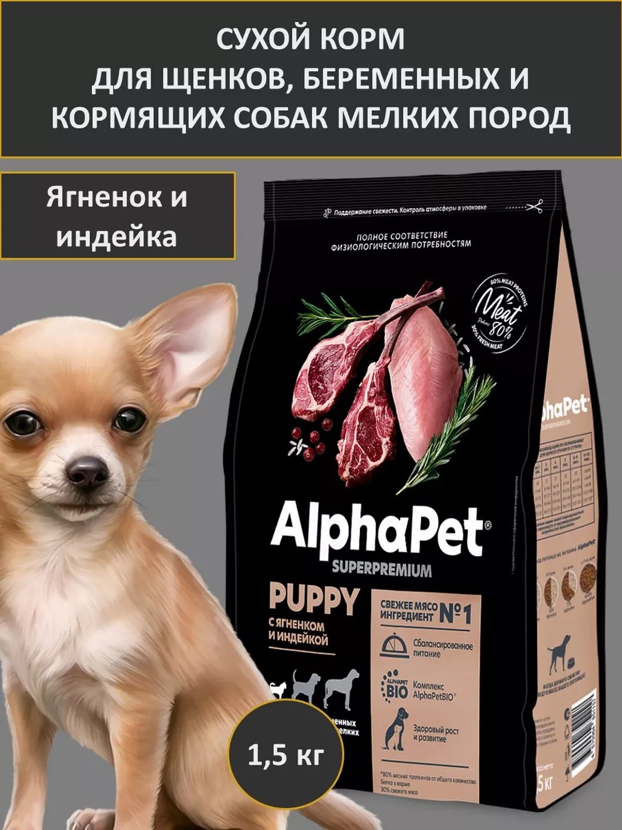 AlphaPet Superpremium dry food for small breed puppies is a complete nutritional supplement with lamb and turkey flavors. This super-premium puppy food is made to the highest quality standards and contains 80% animal protein. Alpha Pet food includes fresh meat, which provides a highly palatable diet. Lamb provides an easily digestible protein. It's suitable for a dietary diet while still providing complete nutrition. This food for small puppies is carefully crafted, preserving the flavor and nutritional properties of fresh meat. Human Grade ingredients are used in the preparation of this puppy food. AlphaPetBIO's unique complex of natural supplements (tomatoes, chicory, yucca schidigera, flaxseed, rosemary, and green-lipped mussel) contains components that support optimal metabolism, immune health, natural intestinal microflora, musculoskeletal health, and digestive and genitourinary health. Optimal levels of Omega-3 and Omega-6 polyunsaturated fatty acids (omega for dogs) support healthy skin and a shiny coat. This dry puppy food contains only natural ingredients (meat, grains, vegetables, and herbs) and is GMO-free, free of artificial colors and flavors. The special shape and small kibble size are specifically designed for small and toy breed puppies. AlphaPet Superpremium dog food is for a healthy and active pet!