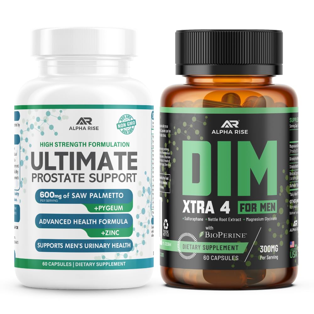 SUPPORTS ATHLETIC PERFORMANCE AND RECOVERY: This formula combines DIM and Magnesium Glycinate to enhance athletic performance. DIM plays a key role in maintaining balanced hormone levels, which are essential for muscle growth and sustained energy during workouts. Meanwhile, Magnesium Glycinate aids muscle function and relaxation, supporting comfort during intense activity and promoting natural recovery. GAIN CONFIDENCE IN THE BEDROOM! - With your issues of frequent urination managed, you'll feel more confident and perform better in the bedroom. These prostate supplement pills for men contain zinc along with pygeum extract, and other herbs that are beneficial to men's health, making Alpha Rise the leading brand of prostate formula and bladder control supplement. PROSTATE HEALTH SUPPORT – Our formula contains 200 mg of Stinging Nettle Root Extract, a traditional herbal ingredient used to help maintain normal prostate size and support healthy urinary flow in men. This well-studied extract is known for its role in supporting men's wellness, including helping ease common age-related urinary concerns and promoting balanced hormone activity by supporting normal DHT pathways. Taken regularly, it contributes to overall prostate comfort and function. SAFE AND EFFECTIVE PROSTATE FORMULA FOR MEN containing SAW PALMETTO 600mg and PYGEUM EXTRACT 300mg along with a range of other natural prostate support ingredients. We display the exact quantity of all ingredients and use natural ratios in our formulation for the highest possible natural potency. EXTRA STRENGTH 4-IN-1 FORMULA FOR MEN – DIM XTRA 4 contains 300 mg of Diindolylmethane (DIM) per serving, specifically designed to support men's hormonal health. This advanced 4-in-1 formula functions as a potent estrogen blocker and aromatase inhibitor, effectively regulating estrogen levels. By promoting hormonal balance, DIM helps improve energy, mood, and overall vitality. This targeted approach makes DIM XTRA 4 an excellent choice for men seeking to optimize their well-being and maintain pe. PROMOTES NIGHTTIME COMFORT within weeks simply by following our Alpha Rise natural prostate health regimen! We ofer the best natural health supplements for men, which along with the correct prostate diet may help control your overactive bladder. Sleep well, trust your body and feel like an ALPHA MALE.